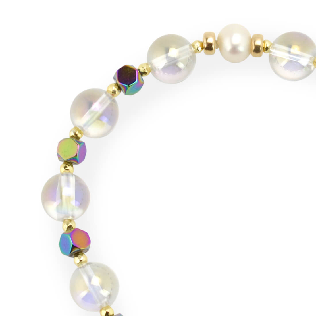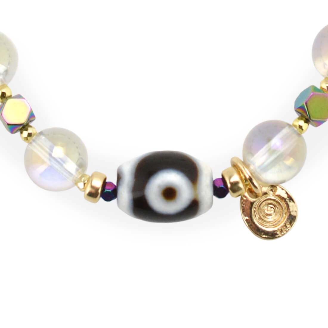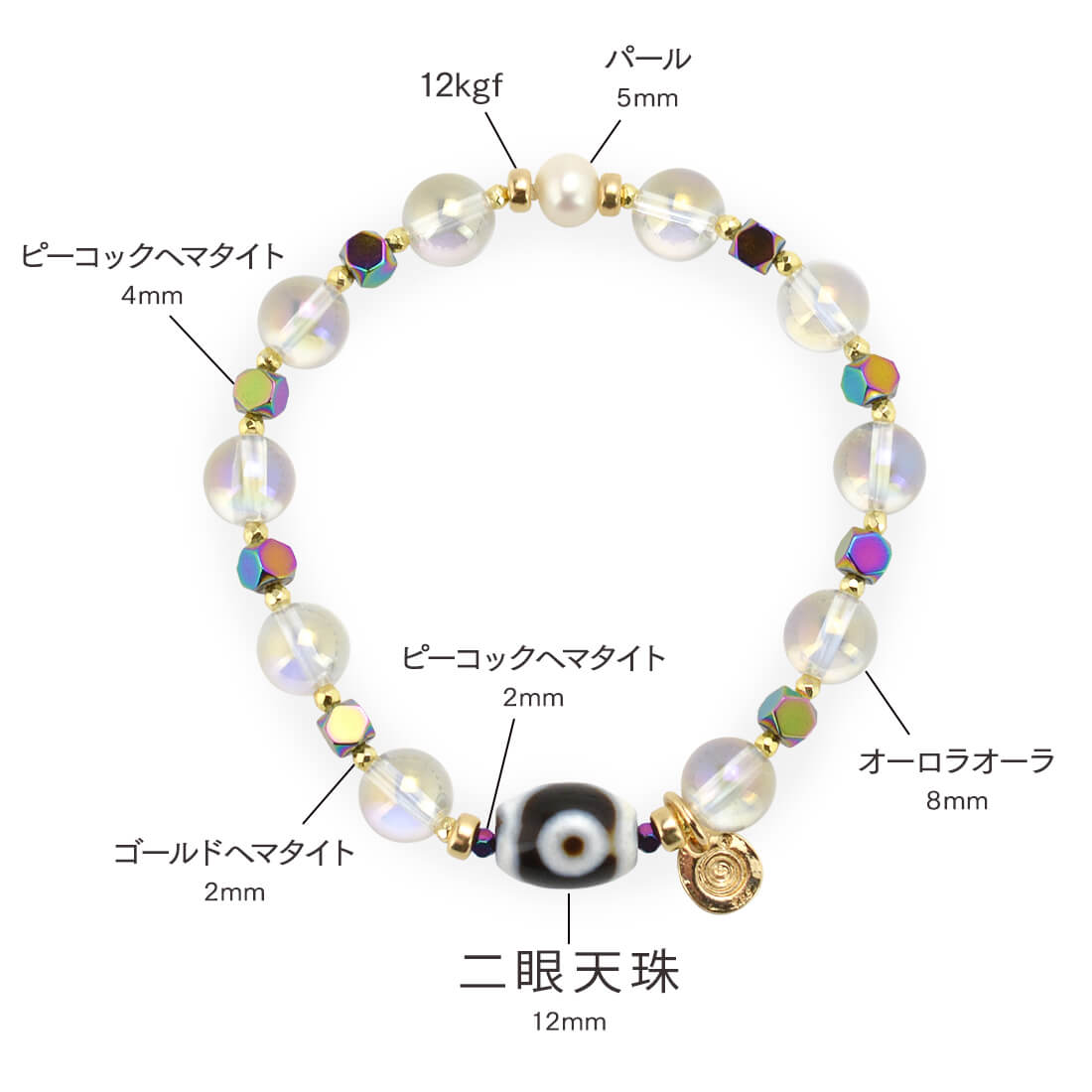 恋愛成就・夫婦円満・相互理解に力を発揮し、商売においても調和を促すといわれている二眼天珠に、ストレスを軽減させ、精神力や独創的な思考を高めるといわれるピーコックヘマタイト、夢や目標に向かって、一歩踏み出す力を与えるとされるオーロラオーラ、美の象徴とされ、女性のステータスを上げるといわれているパールや、持ち主の身を守り生命力を高めるとされ、金運・勝負運アップによいといわれているゴールドヘマタイトなどを組み合わせたブレスレットです。