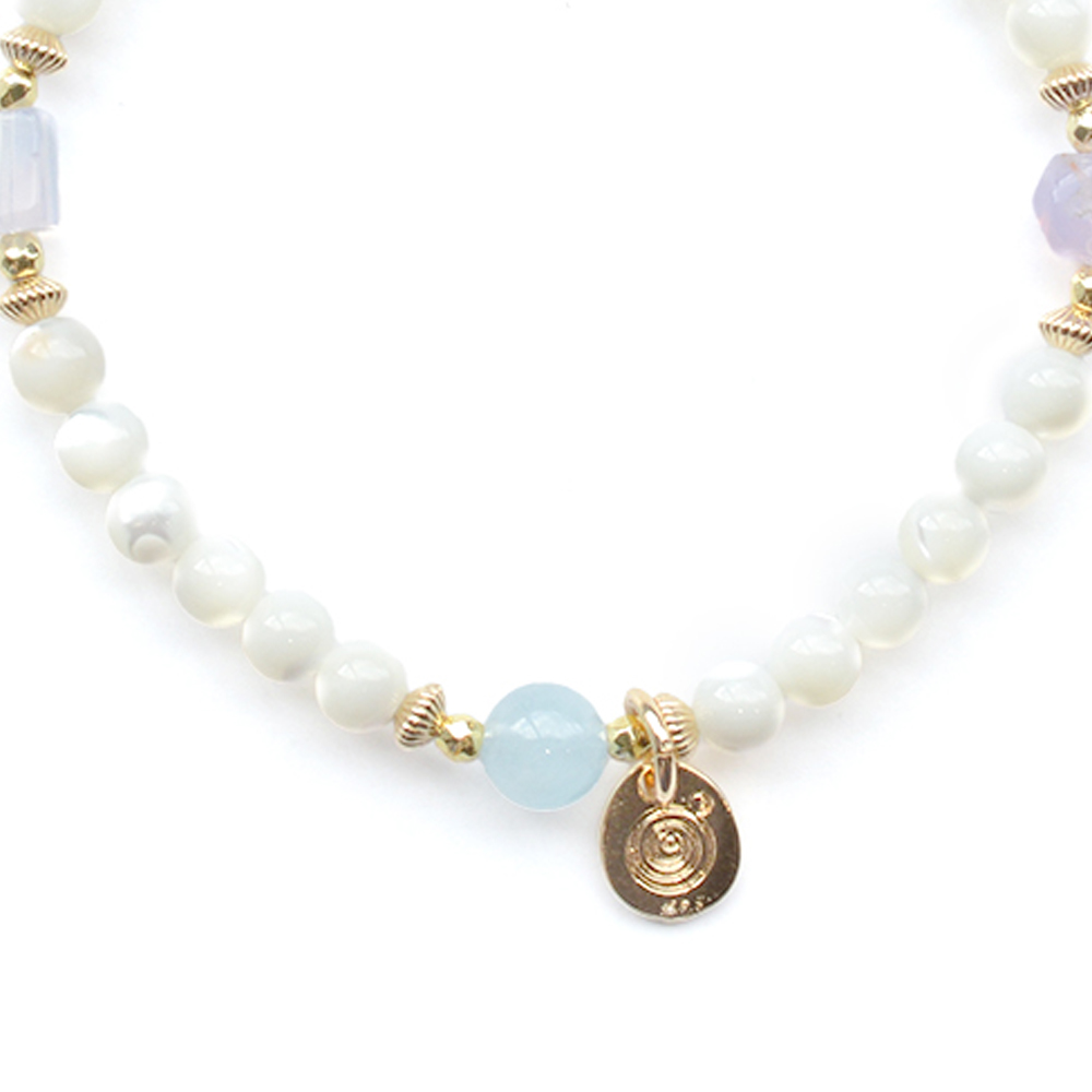 アクアマリン+マザーオブパール+ゴールドヘマタイト+ミルキーアメシスト+14KGF+オリジナルメダルチャーム