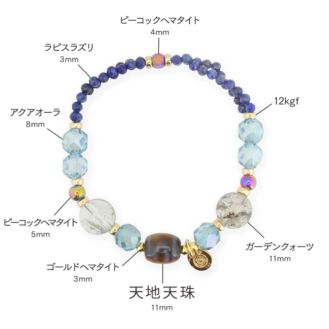 ○は天を表し、□は地を表す。悪い運を良い運に変え、平和円満・災難を消すといわれている天地天珠に、魅力や能力を強く向上させ、感受性を豊かにするとされるアクアオーラなどを組み合わせたブレスレットです。