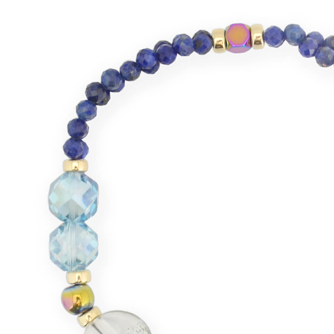 ストレスを軽減させ、精神力や独創的な思考を高めるといわれるピーコックヘマタイト、世界最初のパワーストーンとされ、魔除けの作用や幸運を招き願い事を叶えるといわれるラピスラズリ、疲れを癒し安らぎを与えるとされ、表現力をアップさせるといわれているガーデンクォーツ、持ち主の身を守り生命力を高めるとされ、金運・勝負運アップによいといわれているゴールドヘマタイトなどを組み合わせました。
