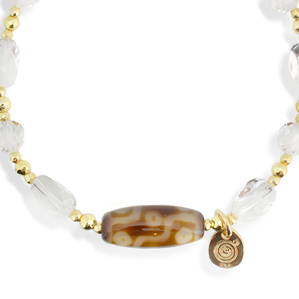 仕事運が向上。願望達成、権力と利益を倍増させるといわれている九眼天珠に、潜在能力を活性化させ、魔除けの作用を持つ万能パワーストーンとされる水晶などを組み合わせたブレスレットです。