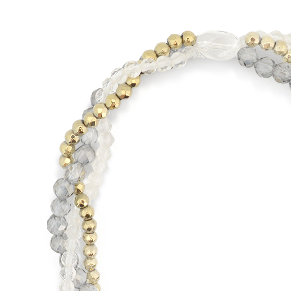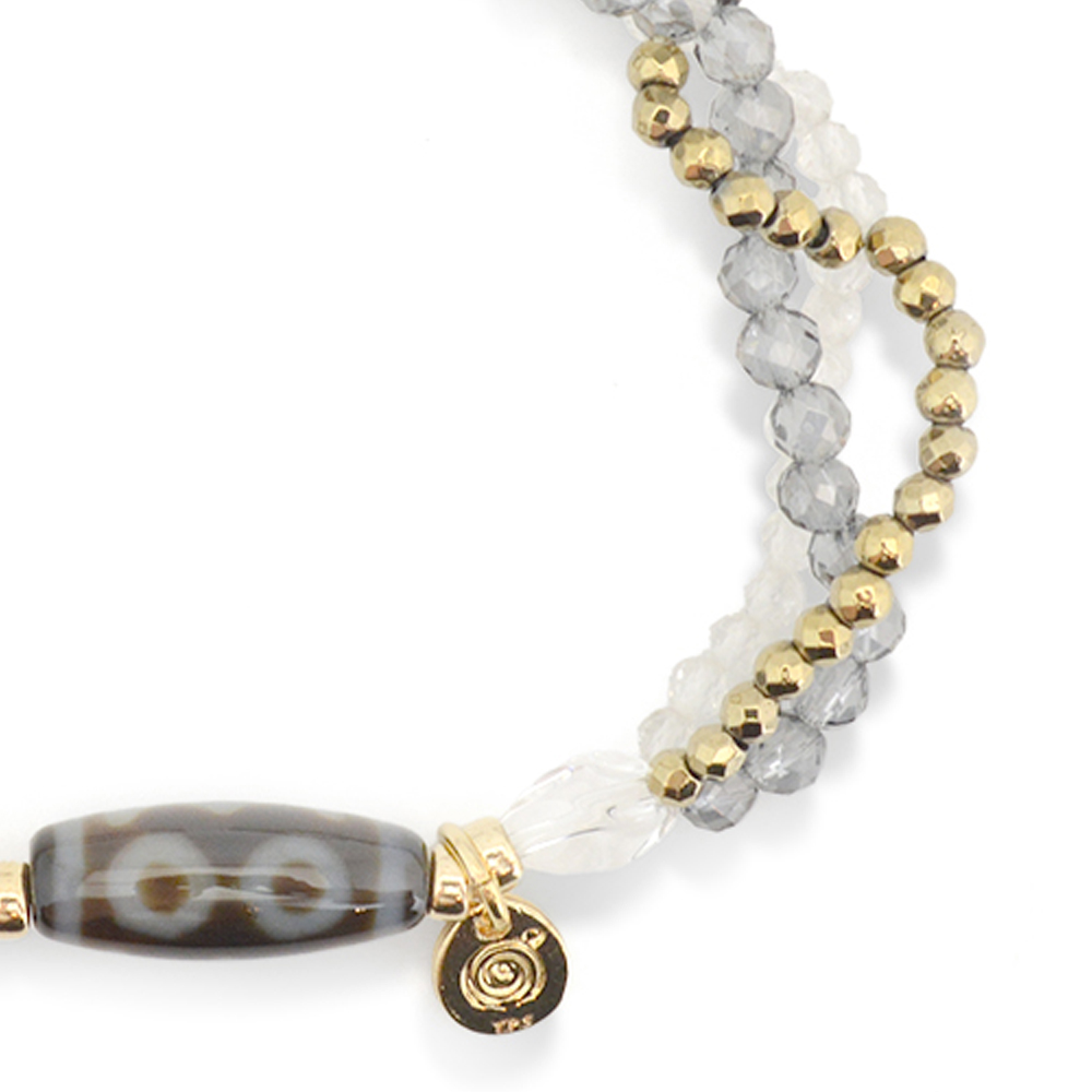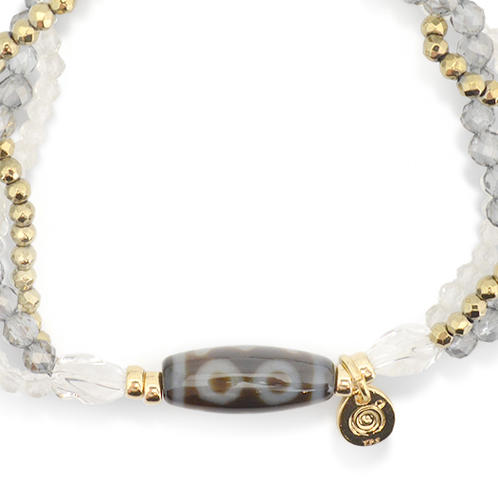 目に見えない未来を見通し、災いを未然に防ぐといわれている三眼天珠に、潜在能力を活性化させ、魔除けの作用を持つ万能パワーストーンとされる水晶などを組み合わせたブレスレットです。