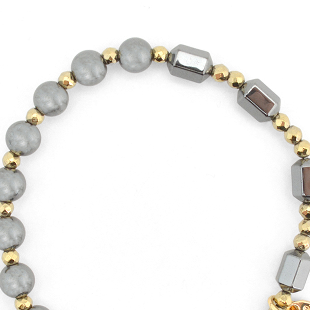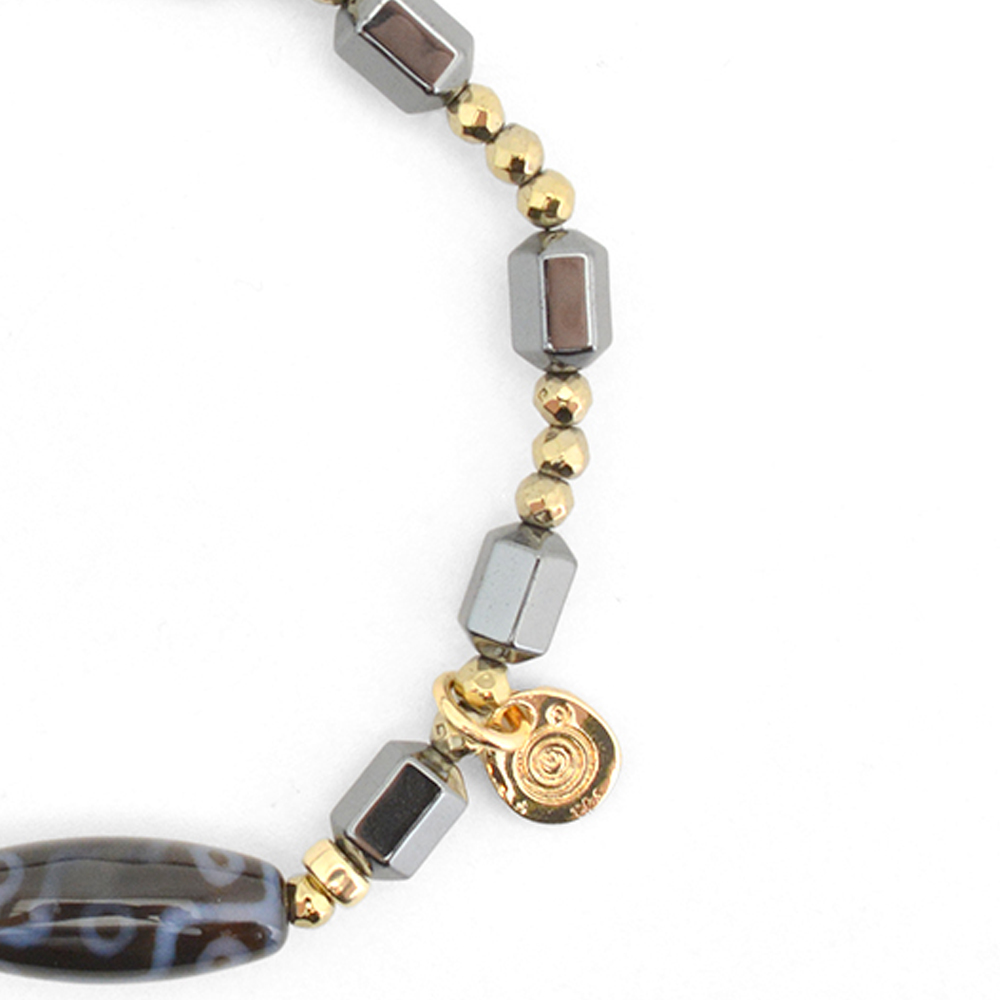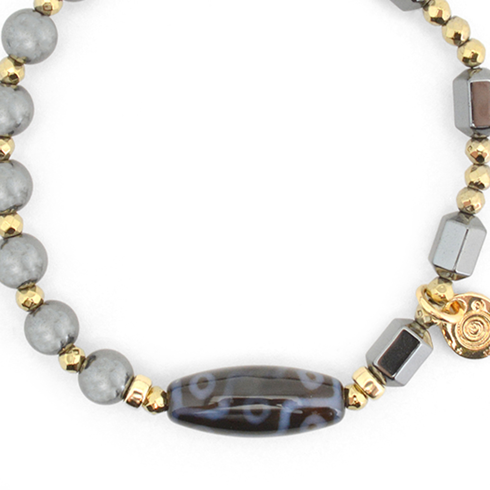仕事運が向上。願望達成、権力と利益を倍増させるといわれている九眼天珠に、目標を達成し、勝利へ導く石とされるヘマタイトなどを組み合わせたブレスレットです。