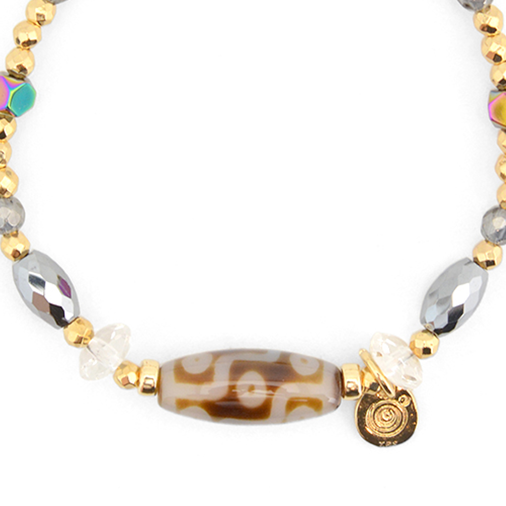 仕事運が向上。願望達成、権力と利益を倍増させるといわれている九眼天珠に、持ち主の身を守り生命力を高めるとされ、金運・勝負運アップによいといわれているゴールドヘマタイトなどを組み合わせたブレスレットです。