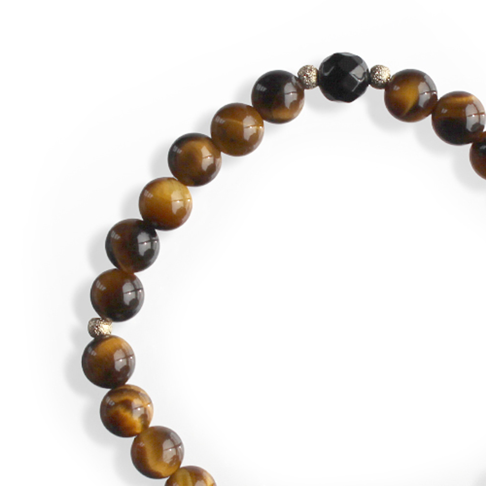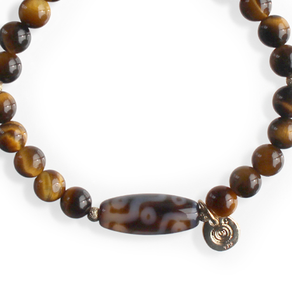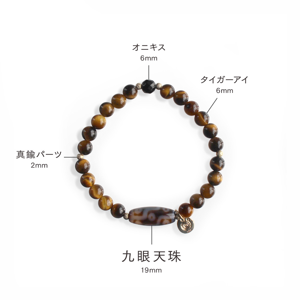 仕事運が向上。願望達成、権力と利益を倍増させるといわれている九眼天珠に、決断力・洞察力を養うとされ、金運・仕事運・勝負運アップによいといわれるタイガーアイなどを組み合わせたブレスレットです。