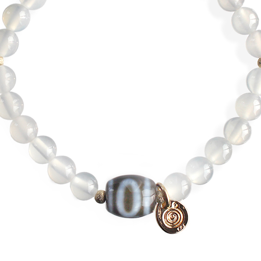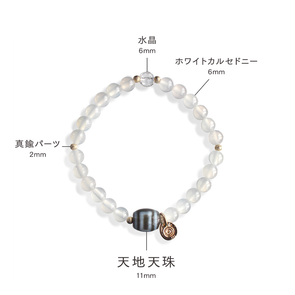 ○は天を表し、□は地を表す。悪い運を良い運に変え、平和円満・災難を消すといわれている天地天珠に、愛情の石と呼ばれ、人間関係の安定や家族の絆を深くしてくれるとされるホワイトカルセドニーなどを組み合わせたブレスレットです。