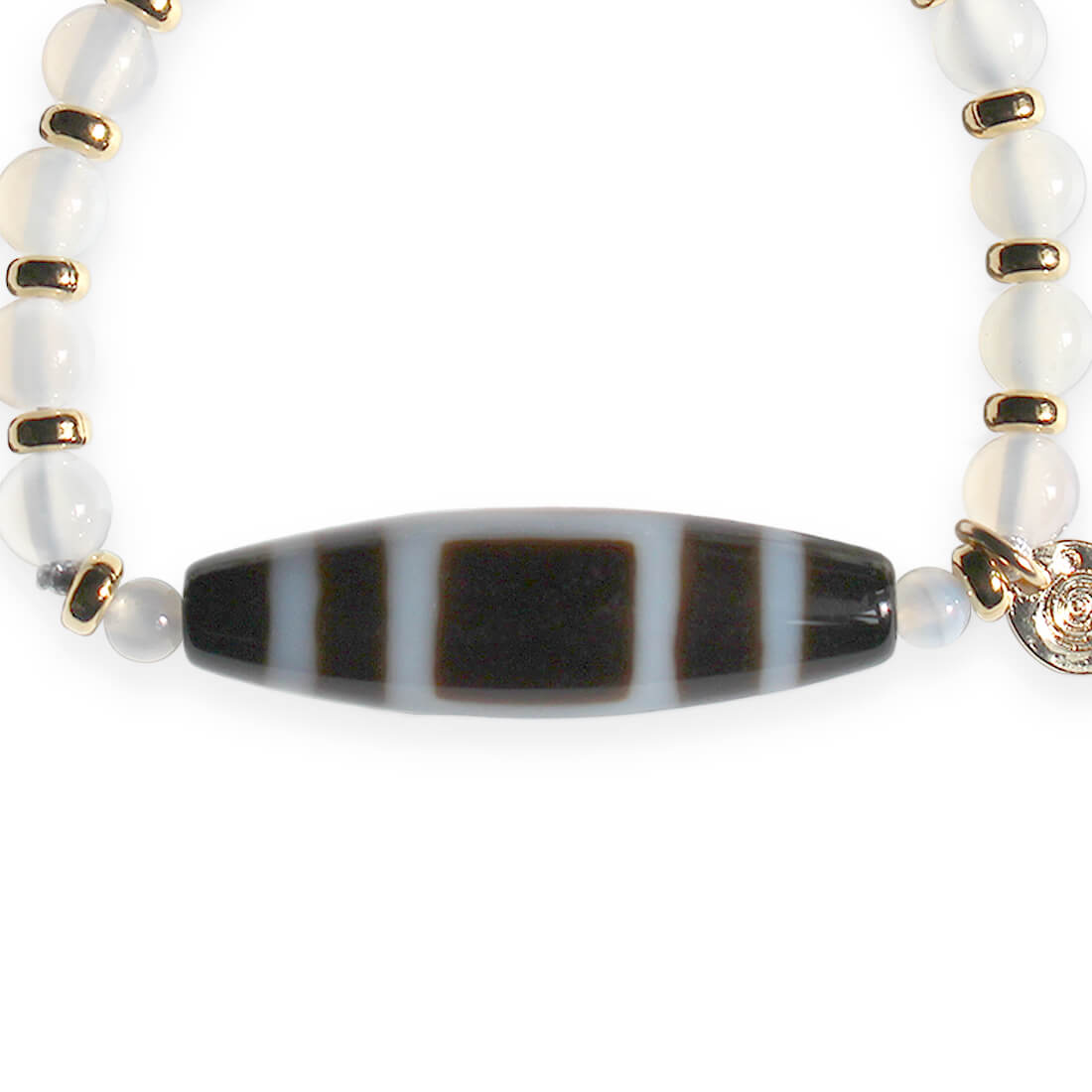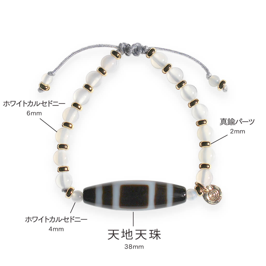 ○は天を表し、□は地を表す。悪い運を良い運に変え、平和円満・災難を消すといわれている天地天珠に、愛情の石と呼ばれ、人間関係の安定や家族の絆を深くしてくれるとされるホワイトカルセドニーなどを組み合わせたブレスレットです。