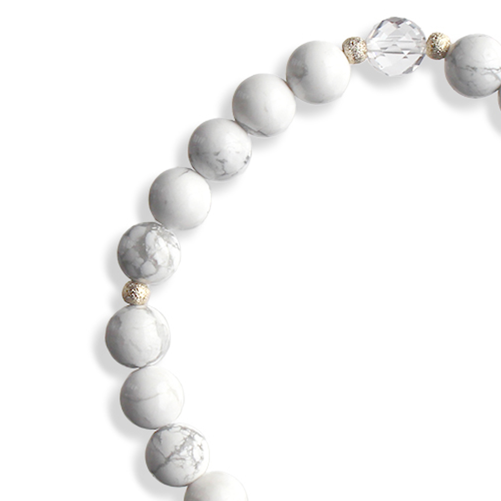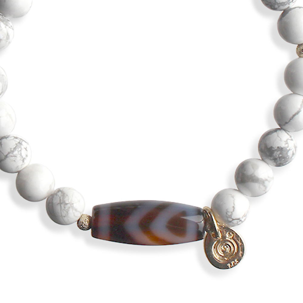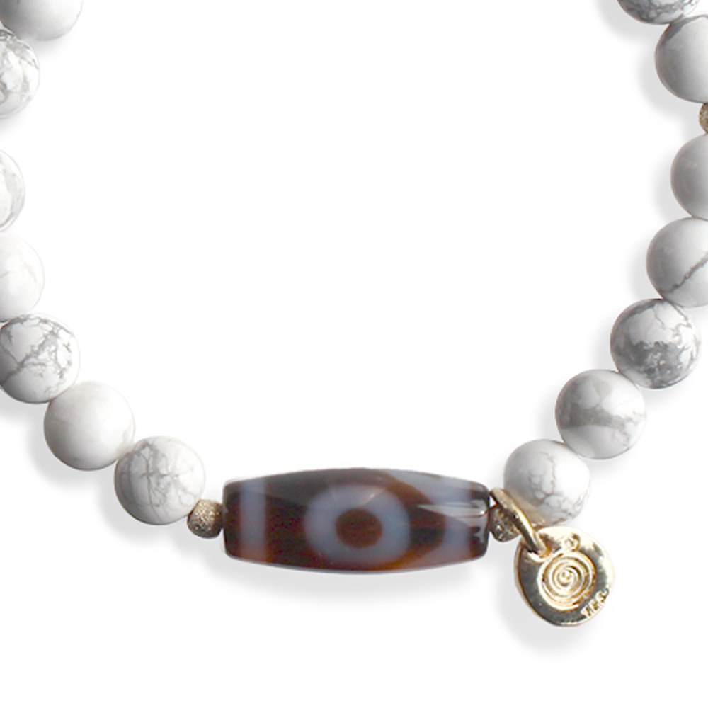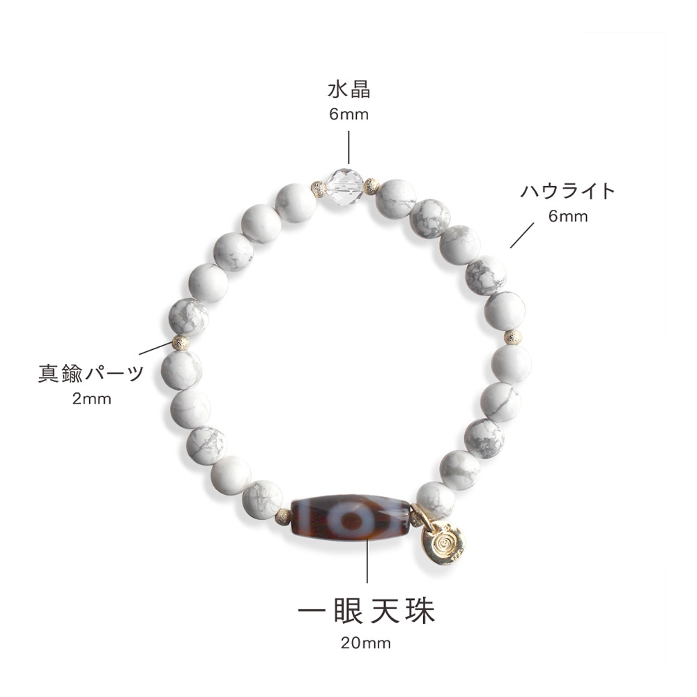 願望達成・学業向上・頭脳明晰・開運へ導くといわれている一眼天珠に、純粋・無垢の象徴。感情を鎮静させ、冷静さや洞察力を取り戻すとされるハウライト、潜在能力を活性化させ、魔除けの作用を持つ万能パワーストーンとされる水晶などを組み合わせたブレスレットです。