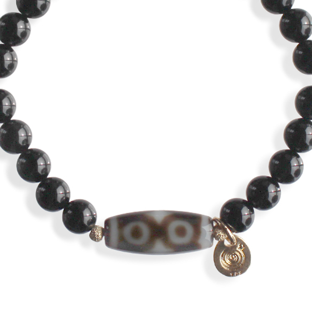 六道輪廻の苦難から脱して苦労を防ぎ、精神力と判断力が身につくといわれ、交通安全にも良いといわれている六眼天珠に、強力な魔除けとされ、集中力をアップさせ冷静さや強い意志を養うといわれているオニキス、潜在能力を活性化させ、魔除けの作用を持つ万能パワーストーンとされる水晶などを組み合わせたブレスレットです。