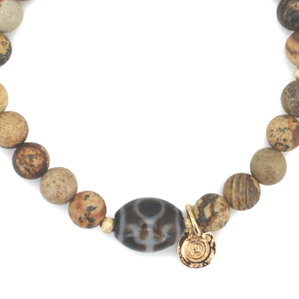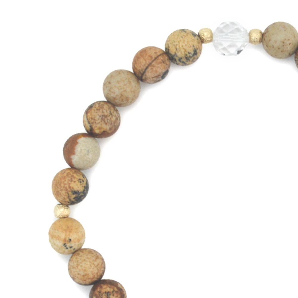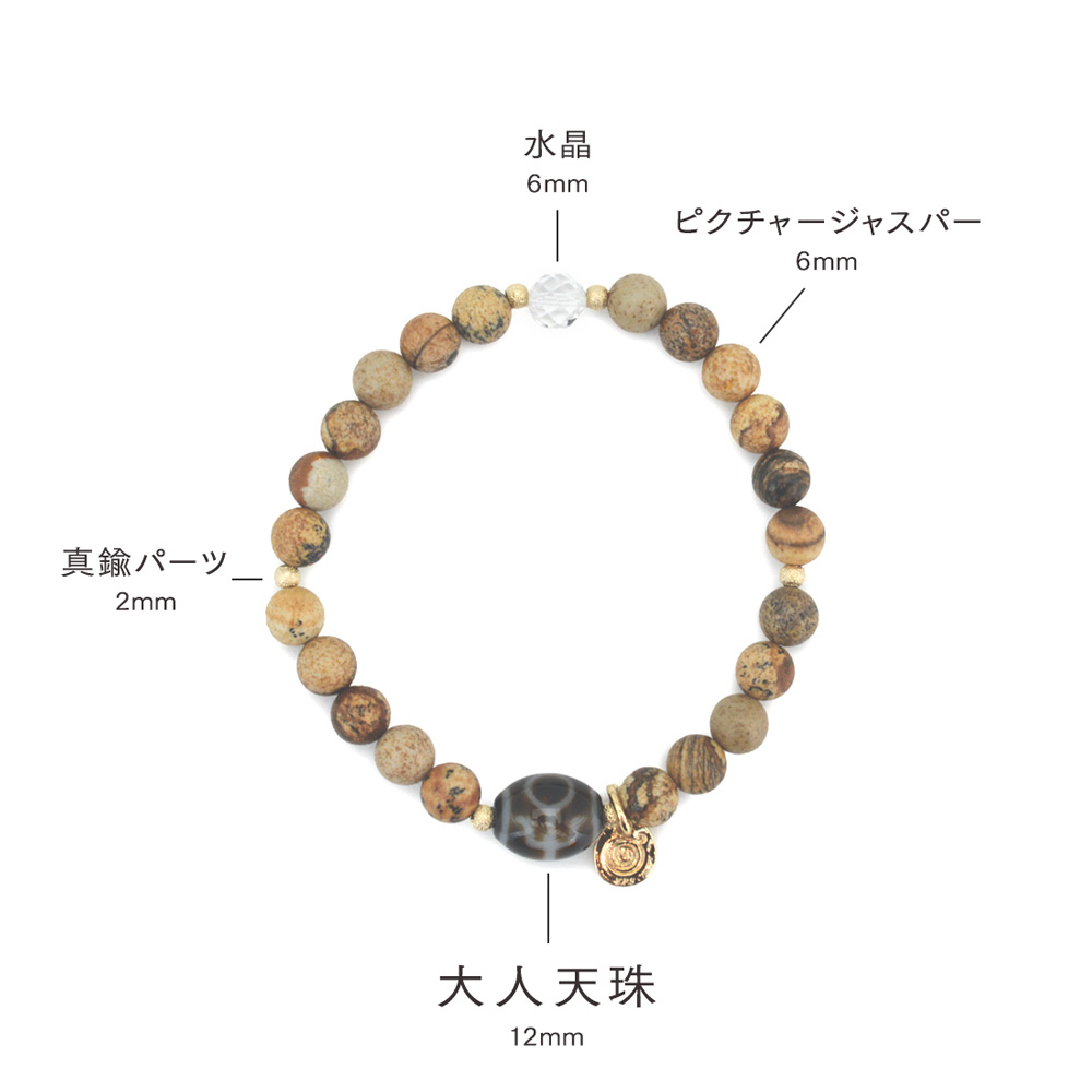 努力が認められ、過去の過ちを消し去り、前向きな行動力が生まれるといわれている大人天珠に、大きな一歩を踏み出す力をサポートし、仕事運・判断力・勝負運を高めるとされるピクチャージャスパー、潜在能力を活性化させ、魔除けの作用を持つ万能パワーストーンとされる水晶などを組み合わせたブレスレットです。