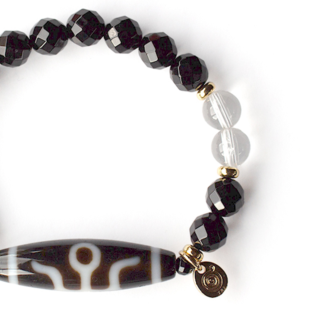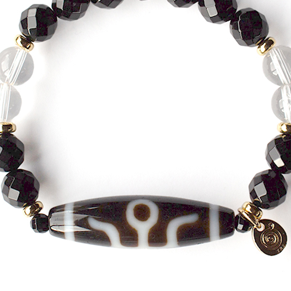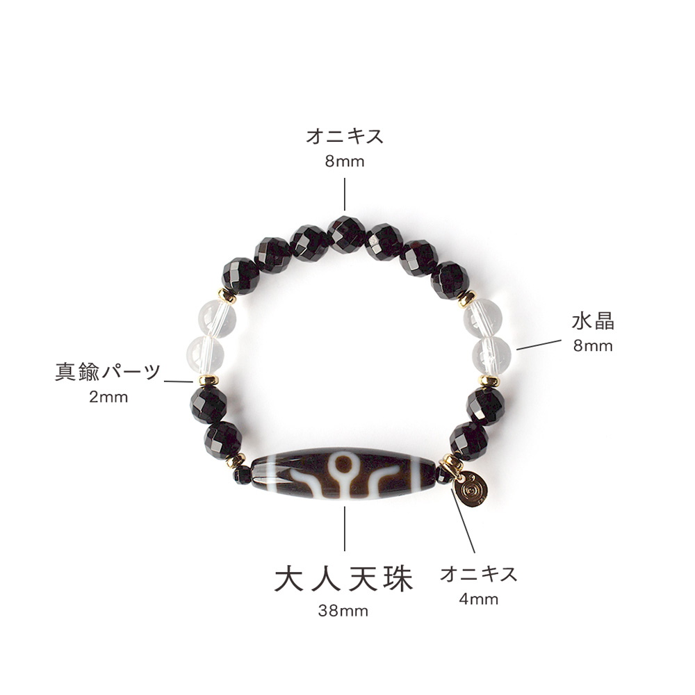 努力が認められ、過去の過ちを消し去り、前向きな行動力が生まれるといわれている大人天珠に、強力な魔除けとされ、集中力をアップさせ冷静さや強い意志を養うといわれているオニキス、潜在能力を活性化させ、魔除けの作用を持つ万能パワーストーンとされる水晶などを組み合わせたブレスレットです。