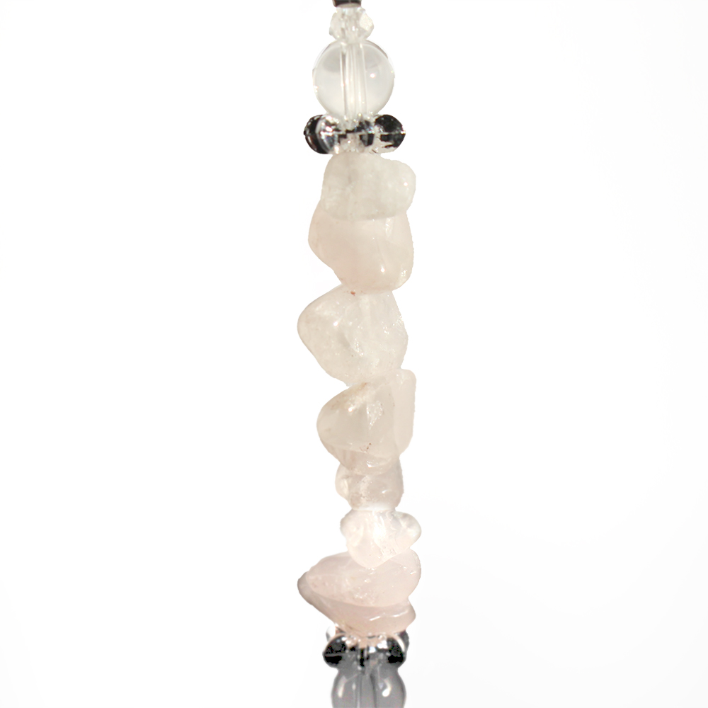 愛の成就・若返りなど、愛と癒しの象徴。美的感覚向上、心身安定によいといわれているローズクォーツ、潜在能力を活性化させ、魔除けの作用を持つ万能パワーストーンとされる水晶、夢や目標に向かって、一歩踏み出す力を与えるとされるオーロラオーラなどを組み合わせたサンキャッチャーです。