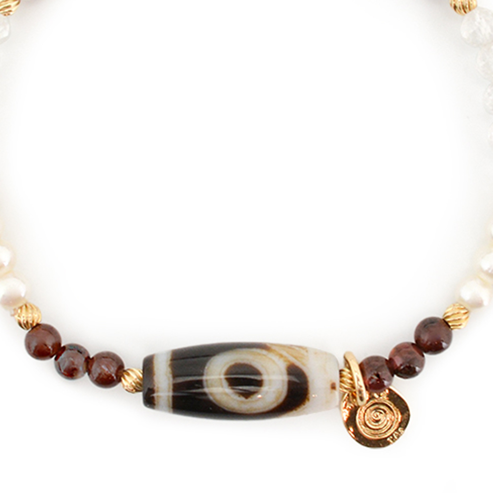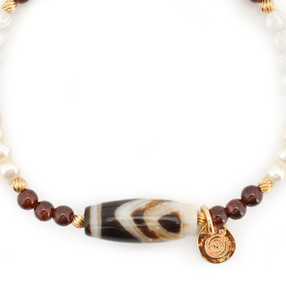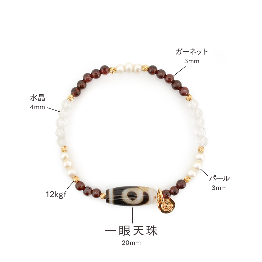 願望達成・学業向上・頭脳明晰・開運へ導くといわれている一眼天珠に、信頼と愛の石と呼ばれ、持ち主にポジティブなパワーを与え成功へと導くとされるガーネットなどを組み合わせたブレスレットです。