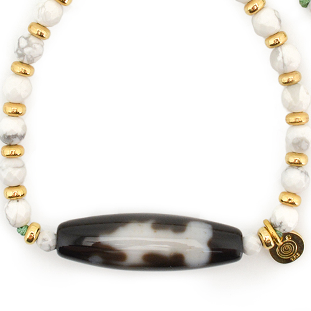 福徳や財宝を与える福の神として、あらゆる願いを叶えてくれるといわれている大黒天天珠に、純粋・無垢の象徴。感情を鎮静させ、冷静さや洞察力を取り戻すとされるハウライトなどを組み合わせたブレスレットです。