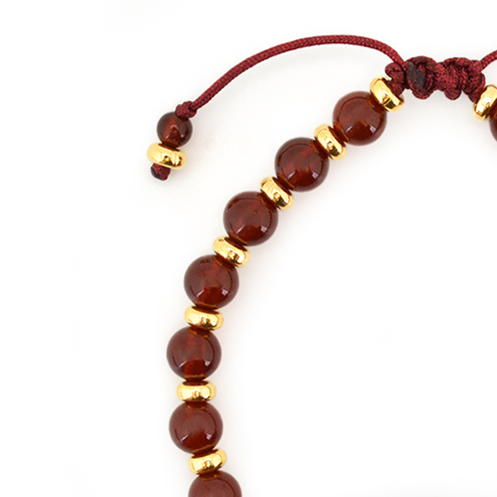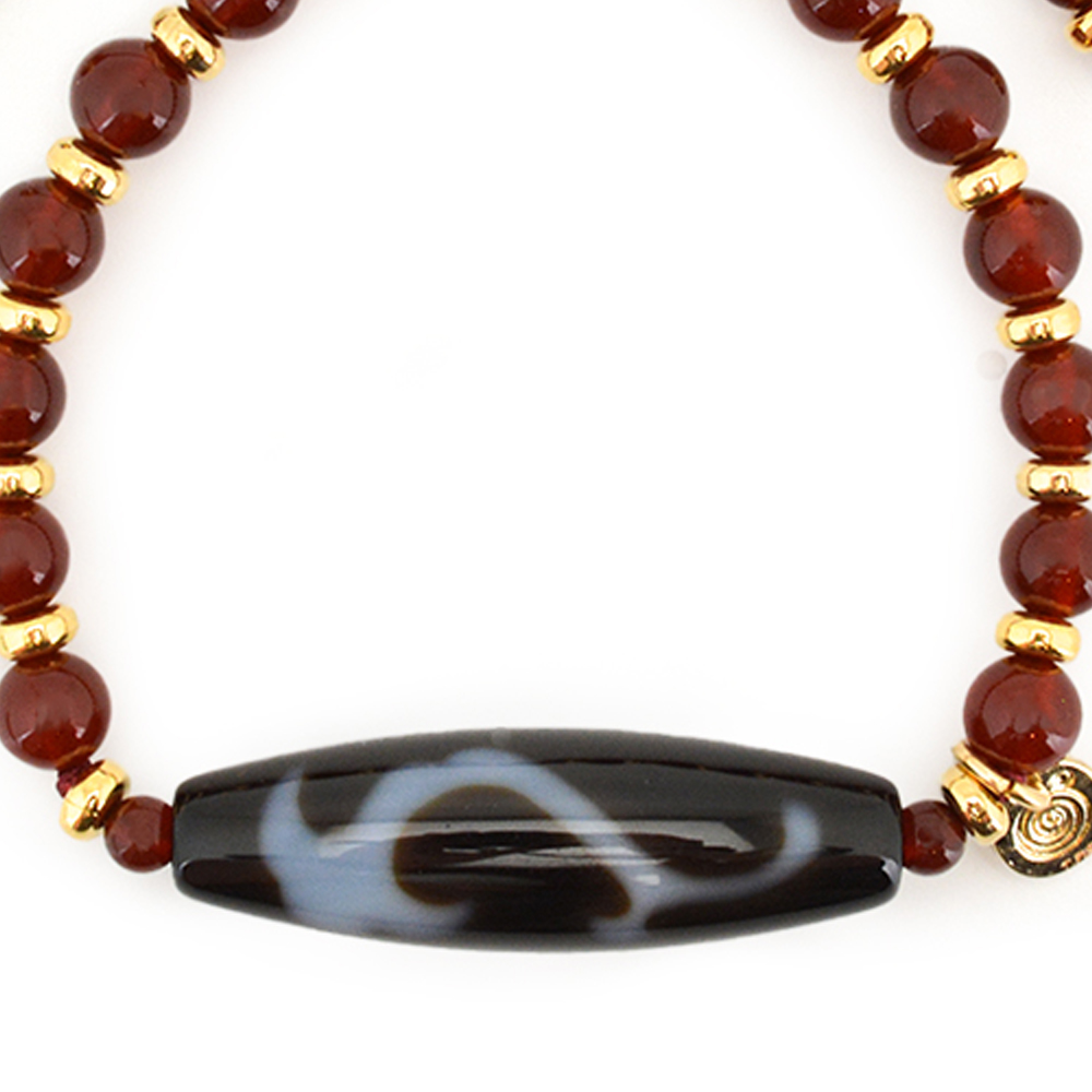 慈愛の象徴で、福財・男女和合・才能開花・積極性の向上により、意の如く事がうまく運ぶといわれている如意天珠に、家庭円満・子宝に恵まれ、情熱や積極性を呼び起こすとされるレッドアゲートなどを組み合わせたブレスレットです。