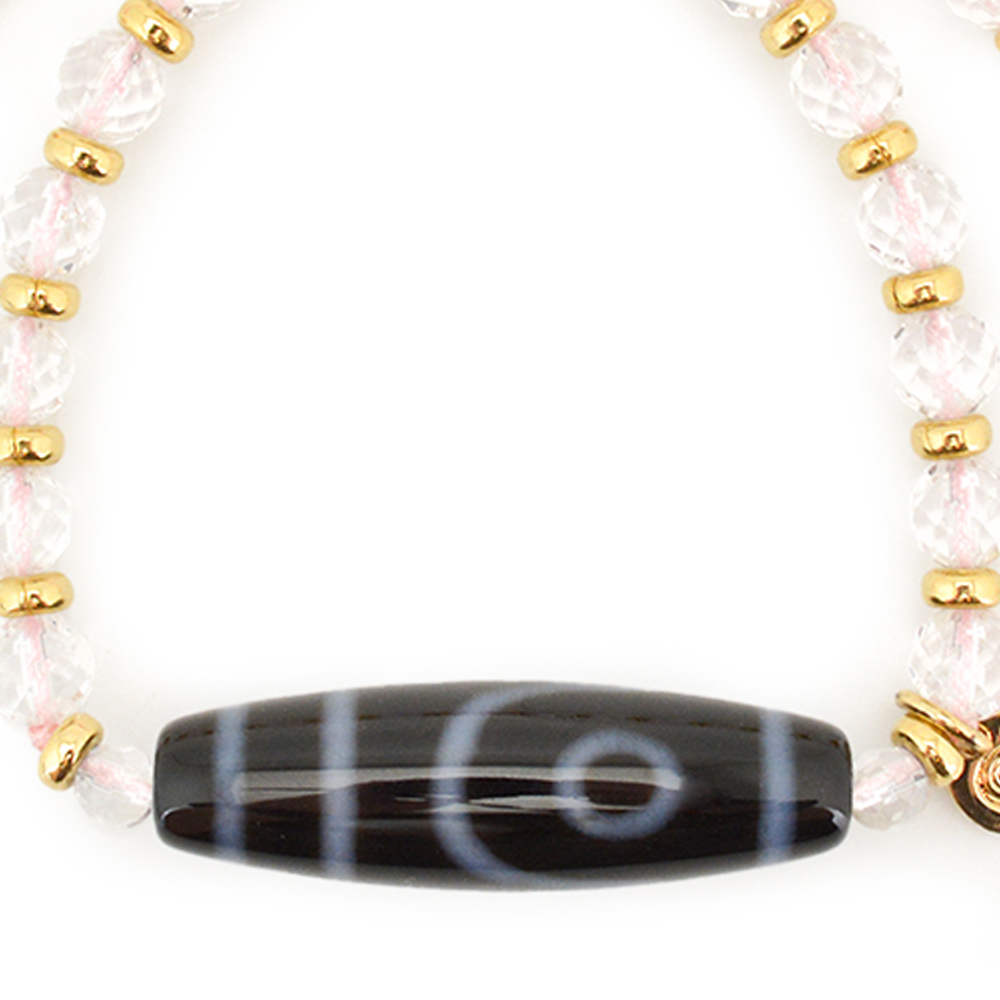 恋愛成就・夫婦円満・相互理解に力を発揮し、商売においても調和を促すといわれている二眼天珠に、潜在能力を活性化させ、魔除けの作用を持つ万能パワーストーンとされる水晶などを組み合わせたブレスレットです。