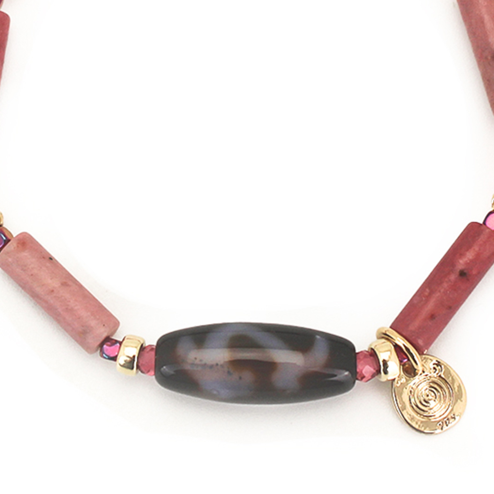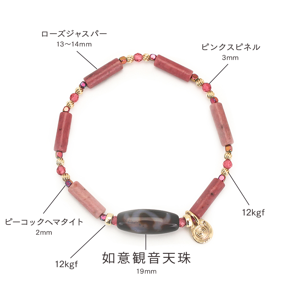 慈愛の象徴で、福財・男女和合・才能開花・積極性の向上により、意の如く事がうまく運ぶといわれている如意天珠と、精神安定・金運招来・病魔退散・平和・幸福に導くといわれている観音天珠のパワーを併せ持つ如意観音天珠に、ストレスを軽減させ、精神力や独創的な思考を高めるといわれるピーコックヘマタイト、物事の集中力を高め、目標達成できるようにサポートしてくれるといわれているピンクスピネルや生命力を高め、健康を保つとされるローズジャスパーなどを組み合わせたブレスレットです。