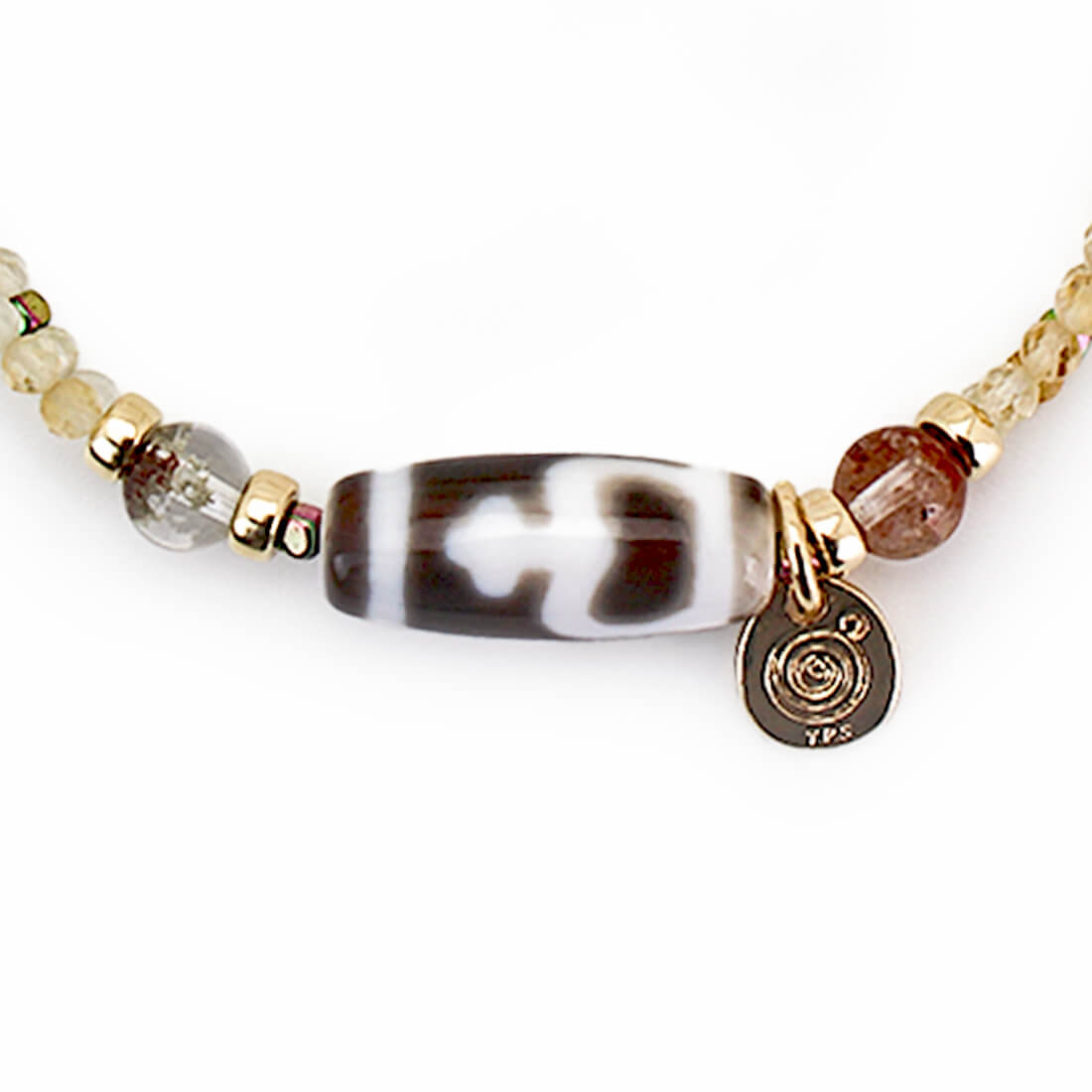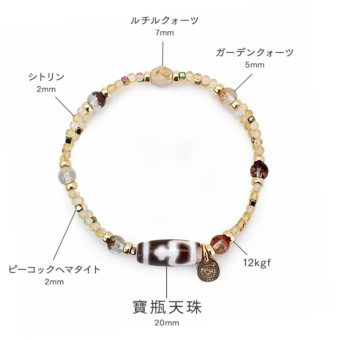 お金が貯まる入れ物を表す。大いなる金運を授かり、大財を築ける。子宝にも恵まれるといわれている寶瓶天珠に、疲れを癒し安らぎを与えるとされ、表現力をアップさせるといわれているガーデンクォーツ、太陽を象徴する石とされ、商売繁盛・事業成功・金運・財運・貯蓄運アップによいといわれているシトリン、ストレスを軽減させ、精神力や独創的な思考を高めるといわれるピーコックヘマタイトや、天使の髪、愛の矢を象徴する石とされ、金運・仕事運アップを強力に高めるといわれるルチルクォーツなどを組み合わせたブレスレットです。
