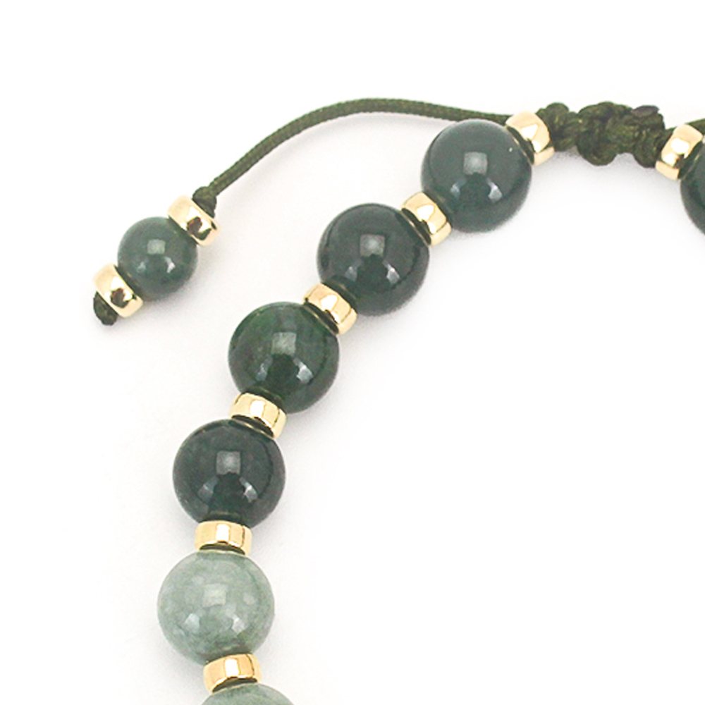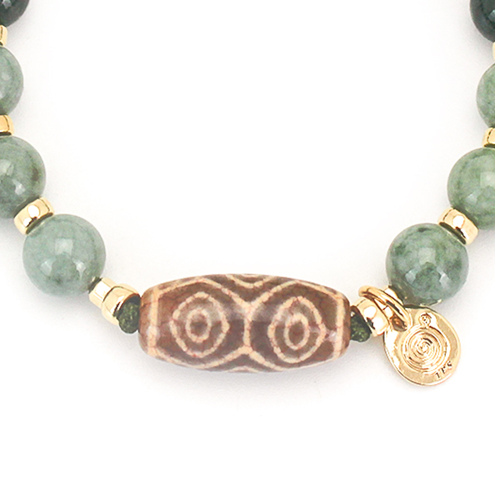 あらゆる運気が向上。苦難を排除し、特に権力・富財が増大するといわれている龍眼天珠に、人生の成功と繁栄・王の象徴とされ、事業成功・精神成長によいといわれる翡翠などを組み合わせたブレスレットです。