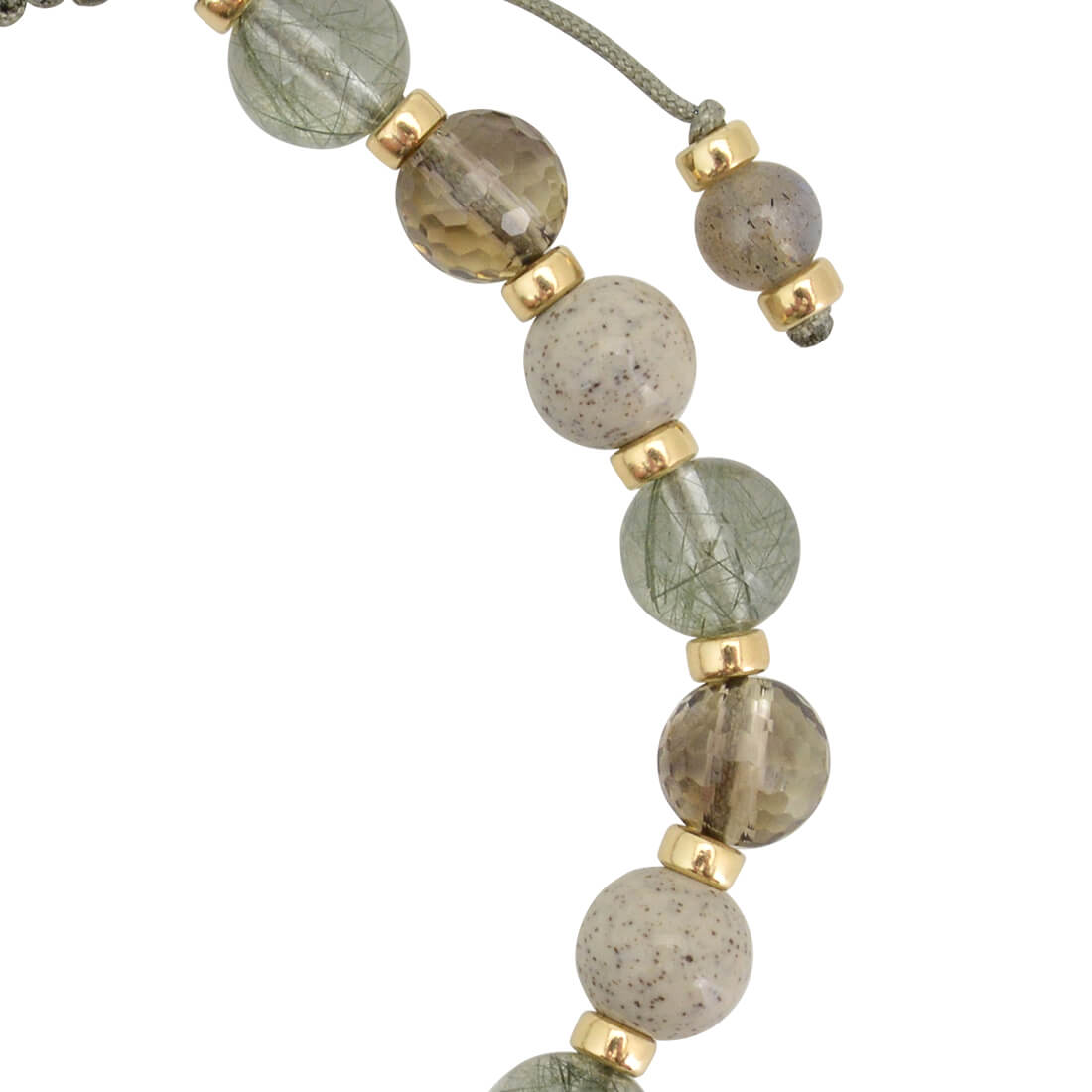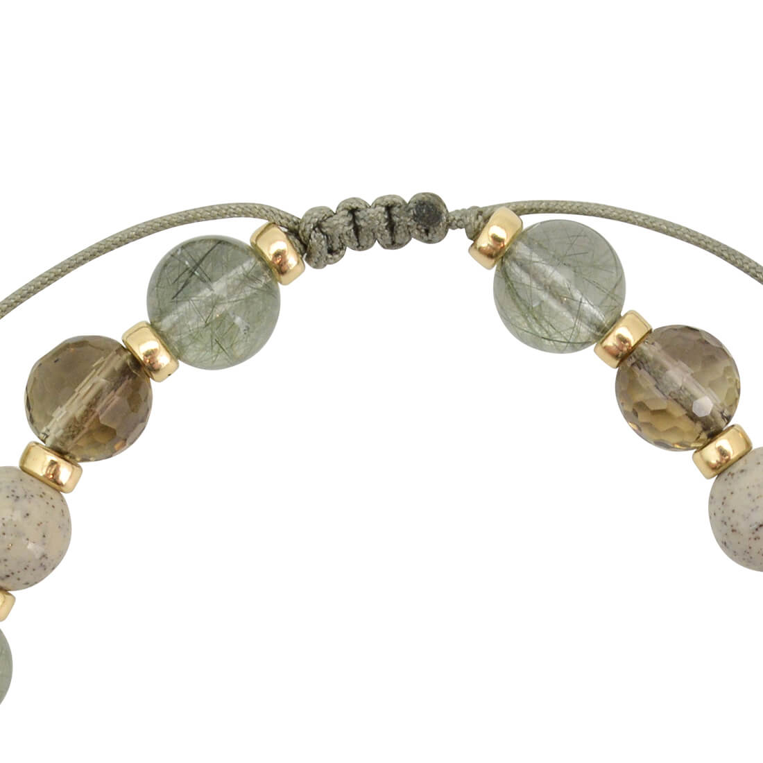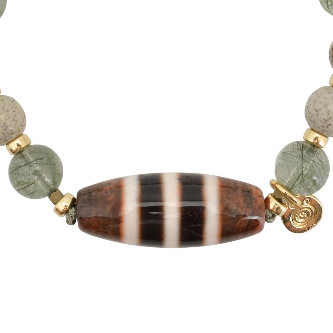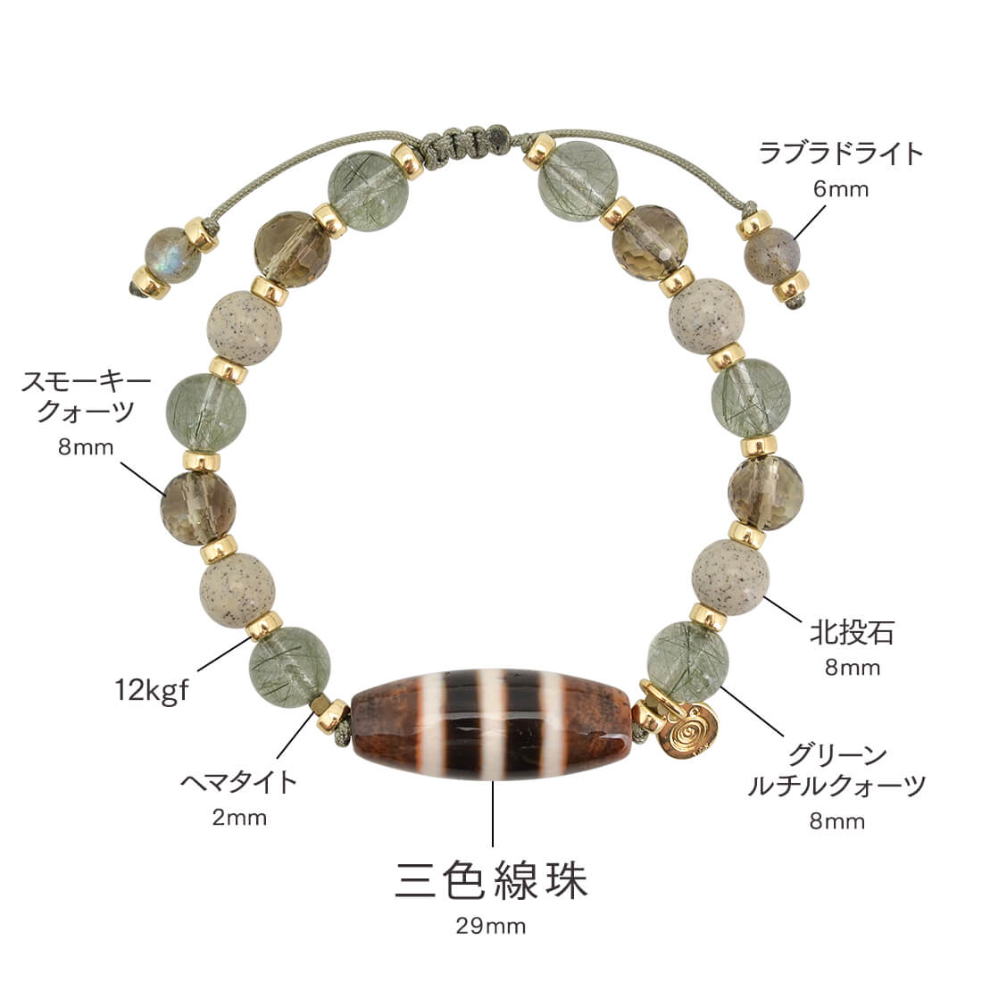 不運を良運に好転させる。人の上に立ち、名声を得られる。仕事や事業の目標達成へ導くといわれている三色線珠に、エネルギーを活性化させ、癒しを与えるといわれている北投石や、天使の髪、愛の矢を象徴する石とされ、金運・仕事運アップを強力に高めるといわれるルチルクォーツ、忍耐力をアップし、争いを鎮めるとされるスモーキークォーツ、月と太陽の象徴。活力・潜在能力の開花を表し、直観力・洞察力を高めるとされるラブラドライト、目標を達成し、勝利へ導く石とされるヘマタイトなどを組み合わせたブレスレットです。