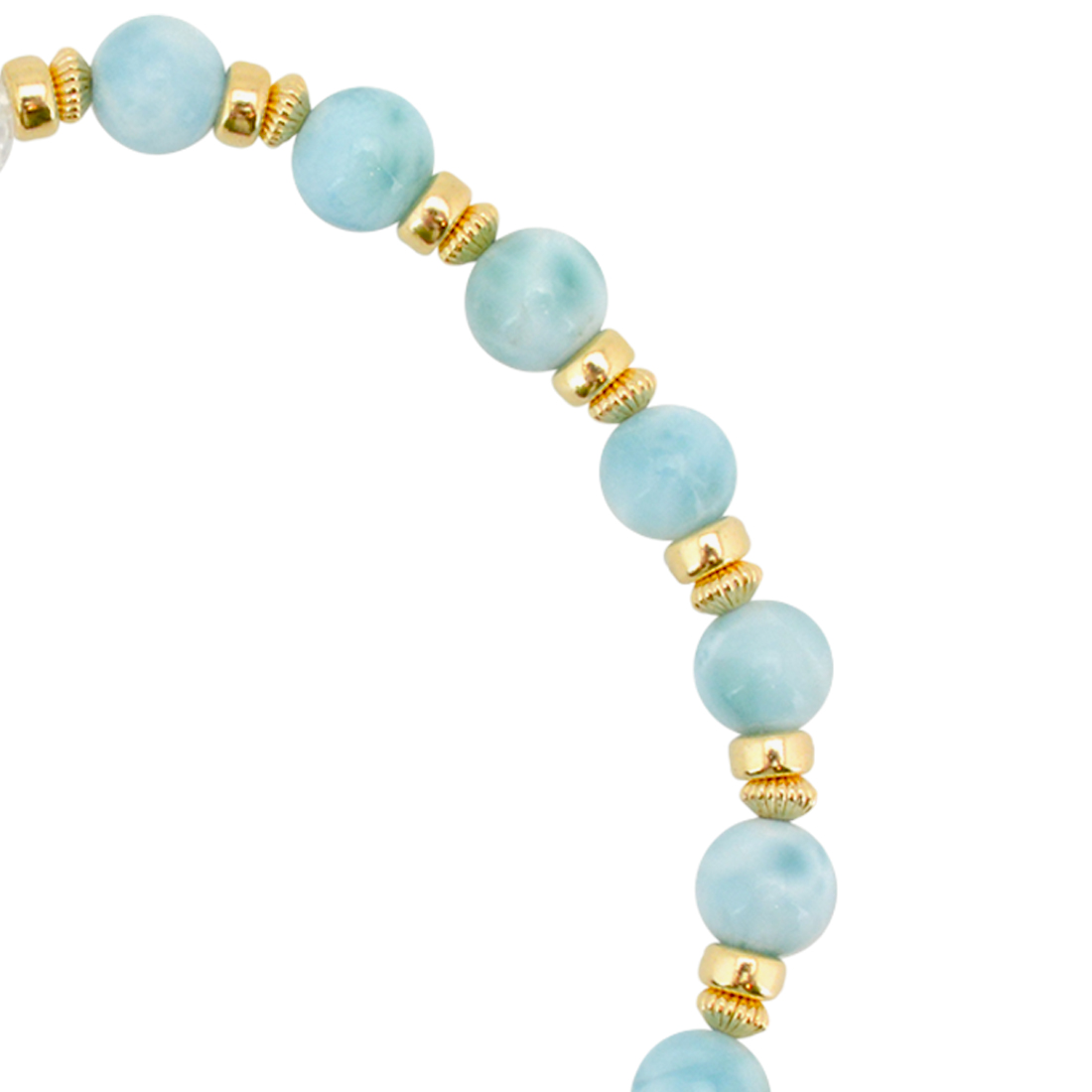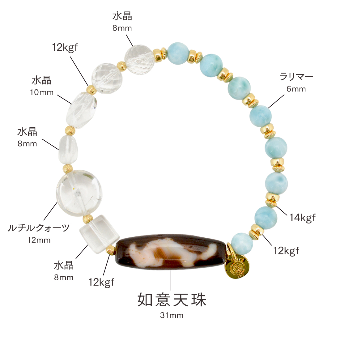 慈愛の象徴で、福財・男女和合・才能開花・積極性の向上により、意の如く事がうまく運ぶといわれている如意天珠に、愛と平和の石と呼ばれ、寛大な心へと導き正しく見極める力を持つとされるラリマーや、潜在能力を活性化させ、魔除けの作用を持つ万能パワーストーンとされる水晶、天使の髪、愛の矢を象徴する石とされ、金運・仕事運アップを強力に高めるといわれるルチルクォーツなどを組み合わせたブレスレットです。