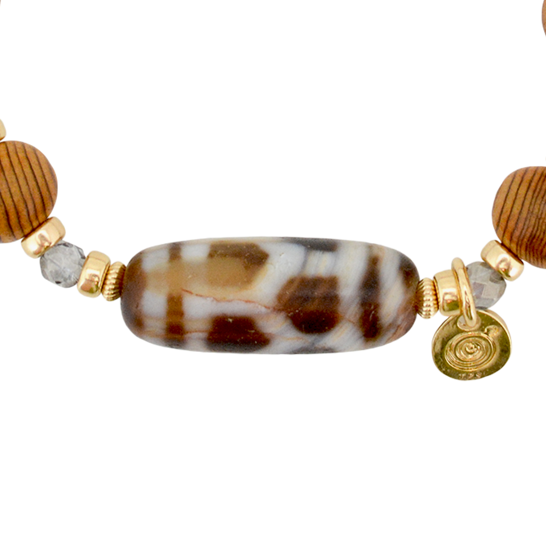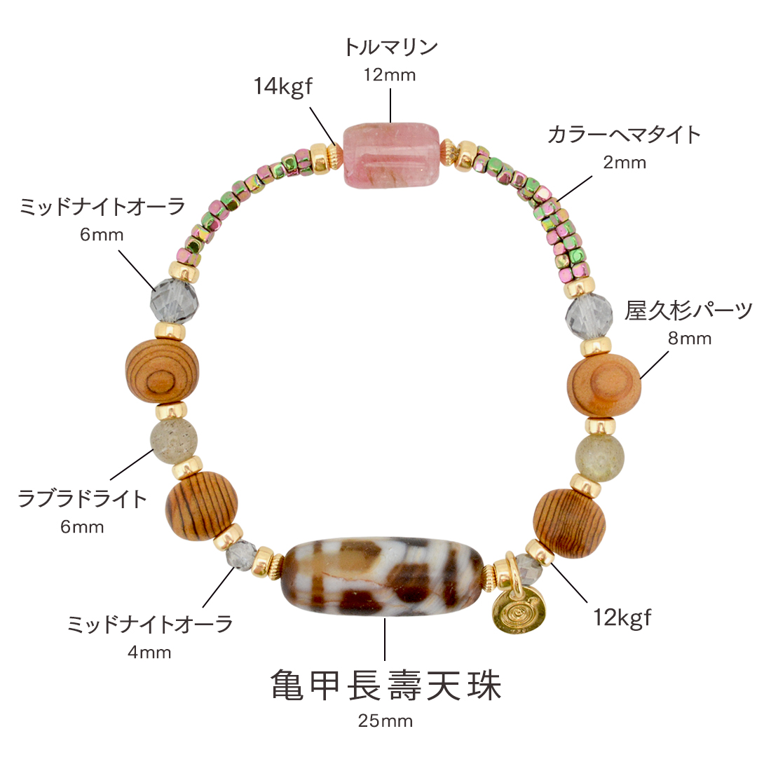 亀の甲羅を表す。病気や事故から身を守り、長生きできるといわれている亀甲長壽天珠に、自身の成長を促し、自信を与えてくれるといわれるミッドナイトオーラや、月と太陽の象徴。活力・潜在能力の開花を表し、直観力・洞察力を高めるとされるラブラドライト、目標を達成し、勝利へ導く石とされるヘマタイト、体に有害な電磁波を防ぎマイナスイオンを発生させ、癒しを与えるとされるトルマリンなどを組み合わせたブレスレットです。