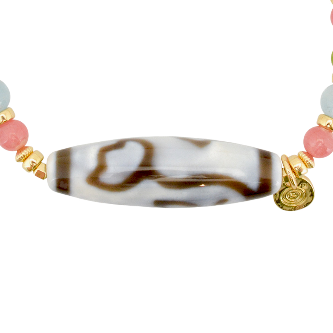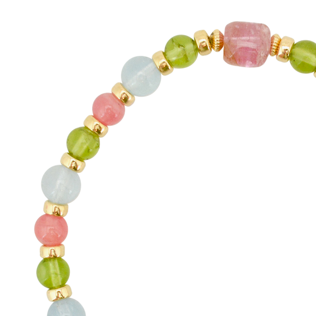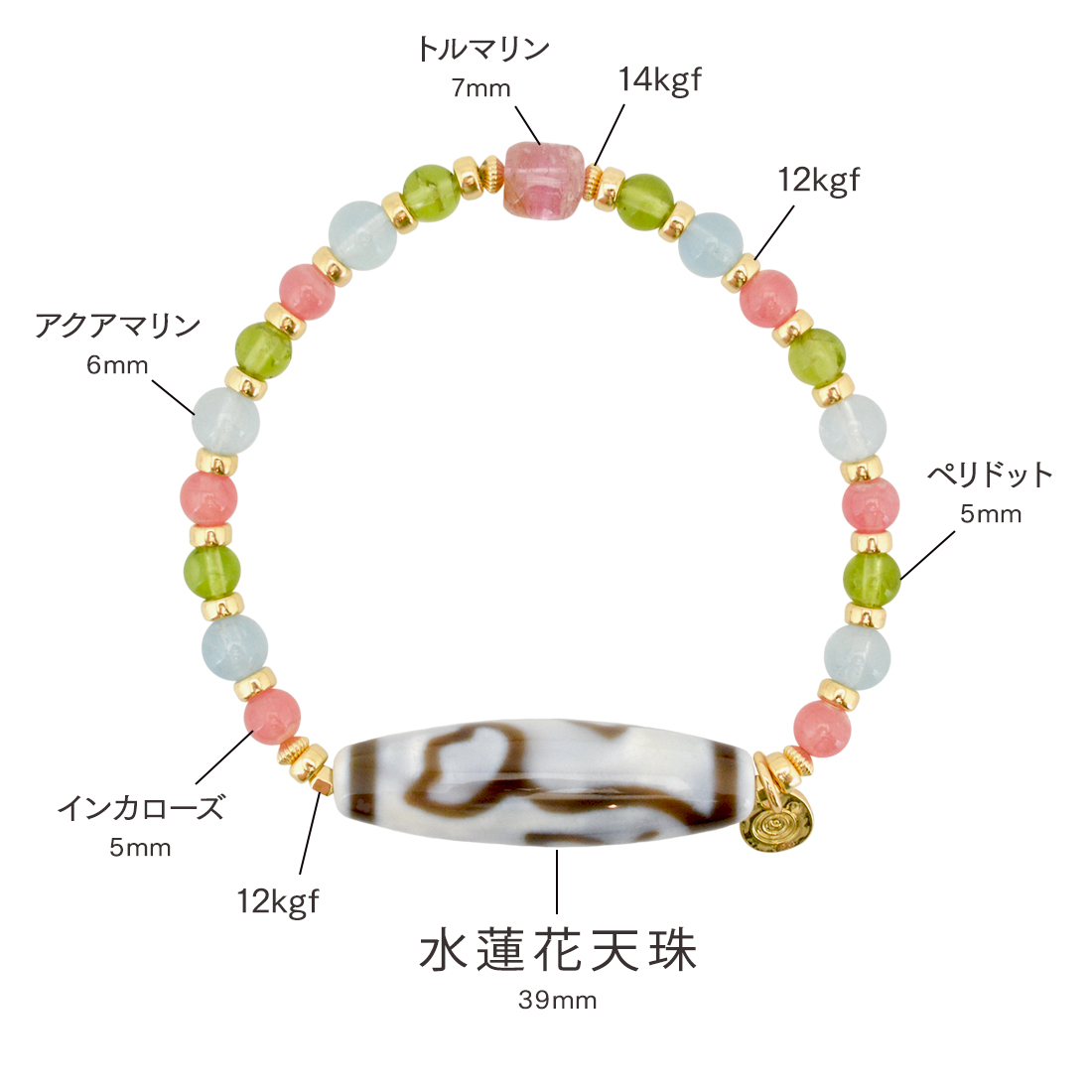 他者の思惑に染まらず自分らしく生きられる。病魔を寄せつけず、健康になるといわれている水蓮花天珠に、傷ついた過去を払拭させるといわれているインカローズや、清らかな癒しのエネルギーで満たしてくれるとされるアクアマリン、内面的に美しく輝くとされ、精神的な暗闇に光の導きをもたらすとされるペリドット、体に有害な電磁波を防ぎマイナスイオンを発生させ、癒しを与えるとされるトルマリンなどを組み合わせたブレスレットです。