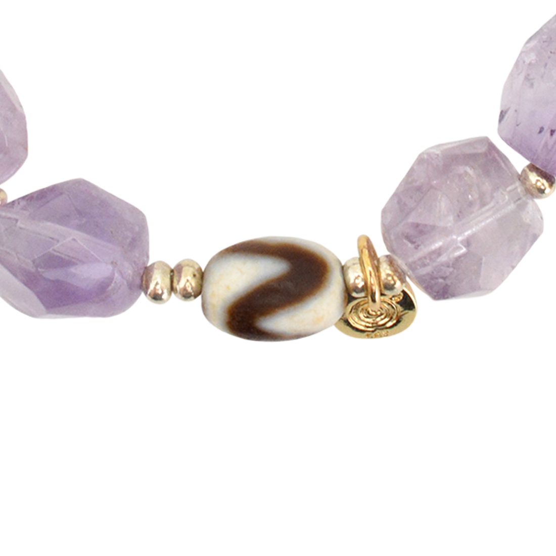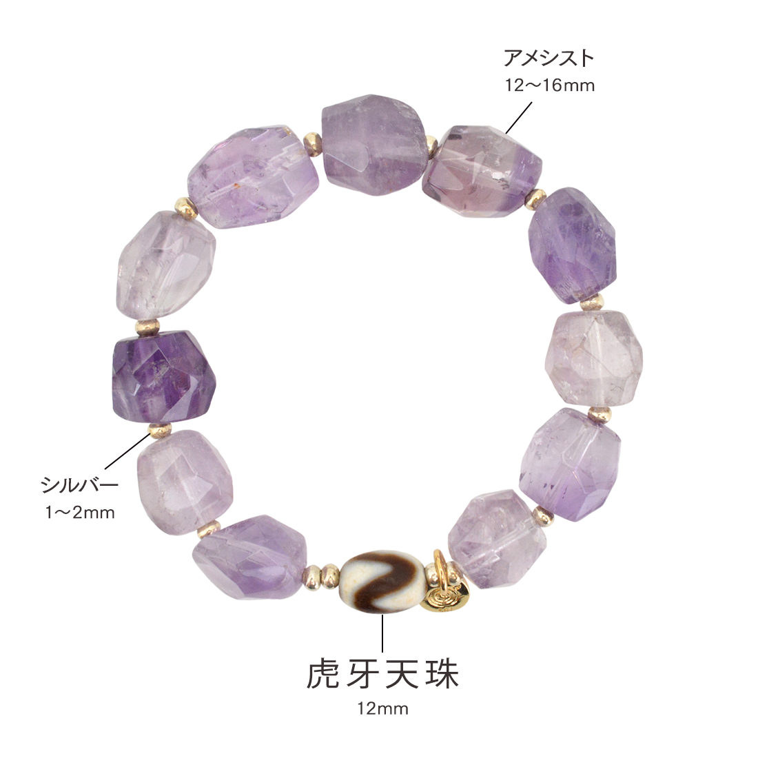 強力な魔除け。虎の勇猛なパワーで、競争に勝つ強運を身につけるといわれている虎牙天珠に、恋愛成就、魅力・才能を引き出すとされるアメシストなどを組み合わせたブレスレットです。
