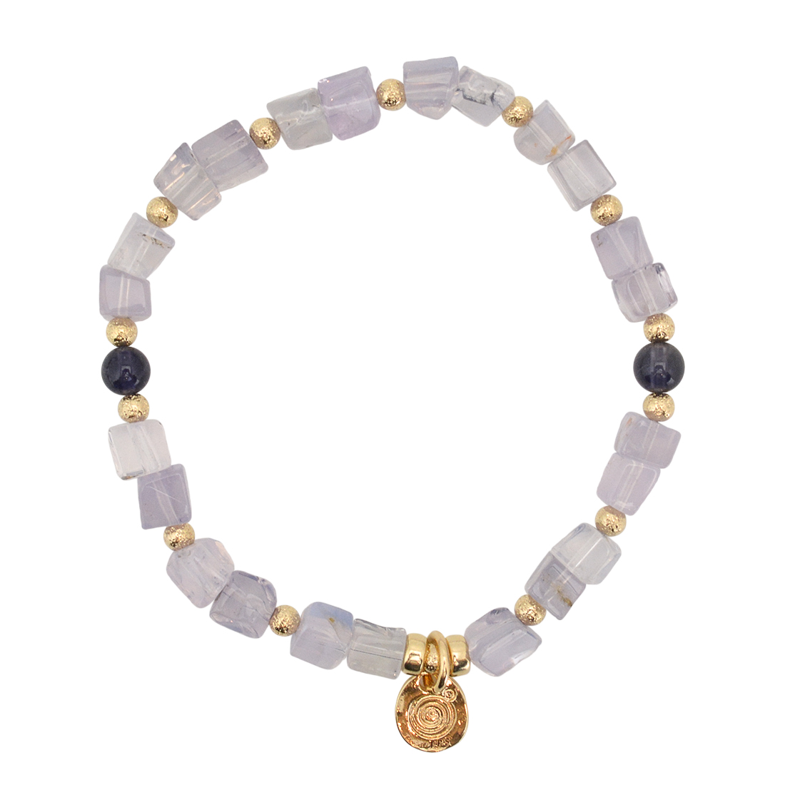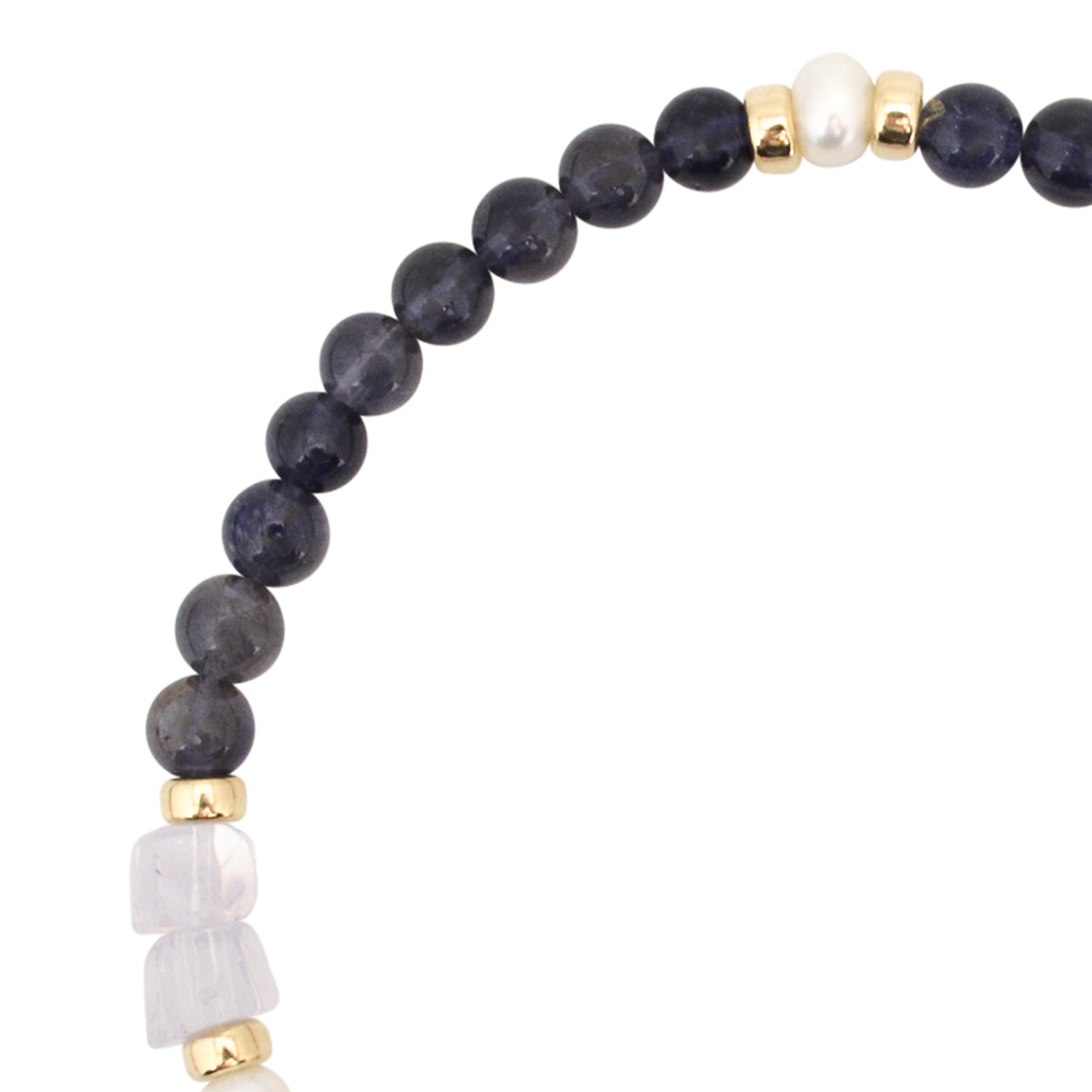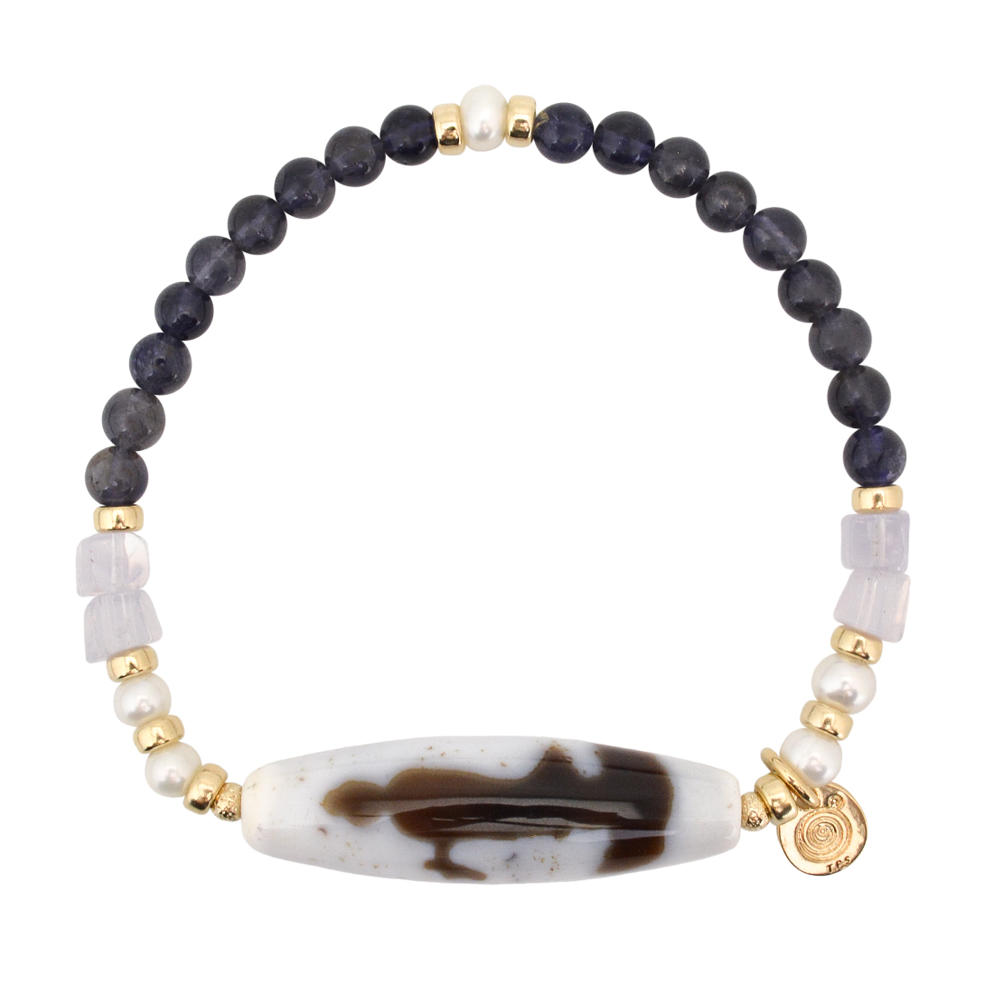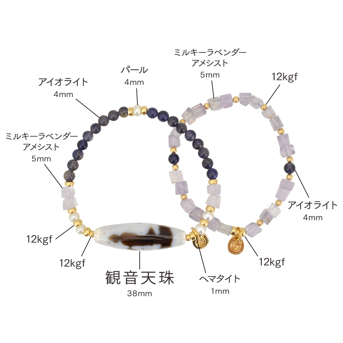 精神安定・金運招来・病魔退散・平和・幸福に導くといわれている観音天珠に、美の象徴とされ、女性のステータスを上げるといわれているパールや、洞察力が高まり、正しい判断が養われるといわれているアイオライト、目標を達成し、勝利へ導く石とされるヘマタイトなどを組み合わせたブレスレットです。