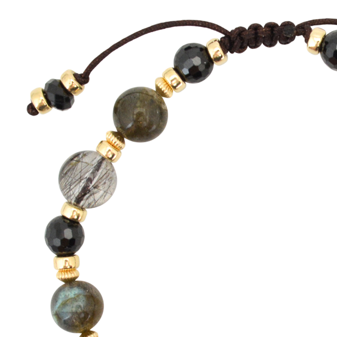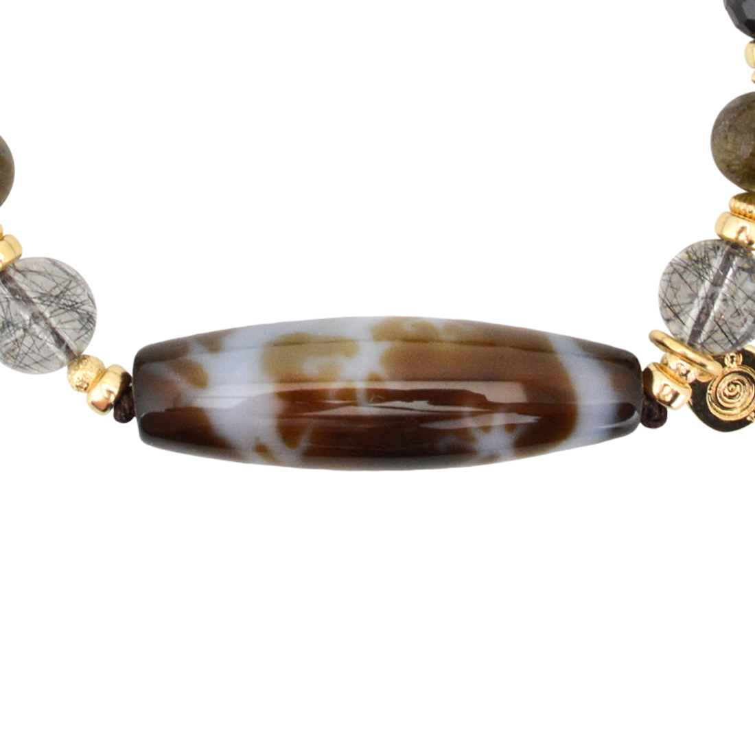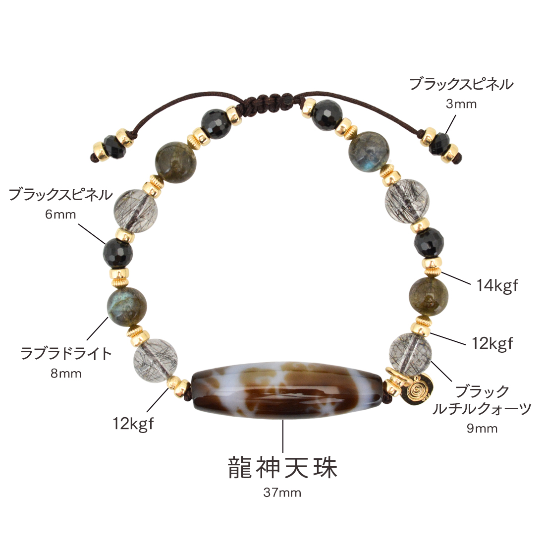 龍神のパワーが身につき、富と繁栄・大いなる幸せを獲得できるといわれている龍神天珠に、金運・仕事運アップを強力に高めるとされ、勝負運も向上するといわれるブラックルチルクォーツや、月と太陽の象徴。活力・潜在能力の開花を表し、直観力・洞察力を高めるとされるラブラドライト、財力・権力に恵まれ、富やチャンスを引き寄せるとされるブラックスピネルなどを組み合わせたブレスレットです。