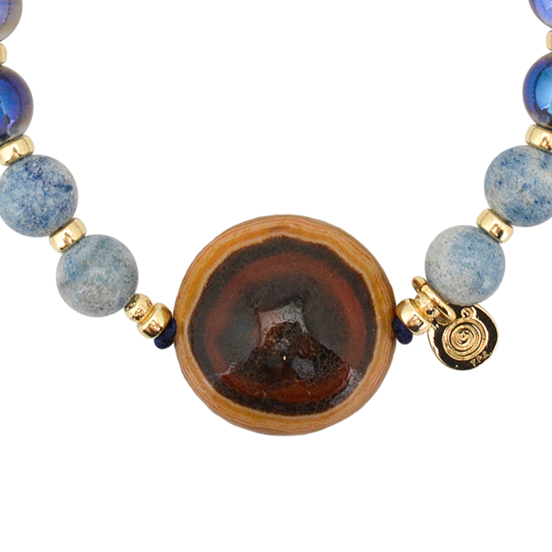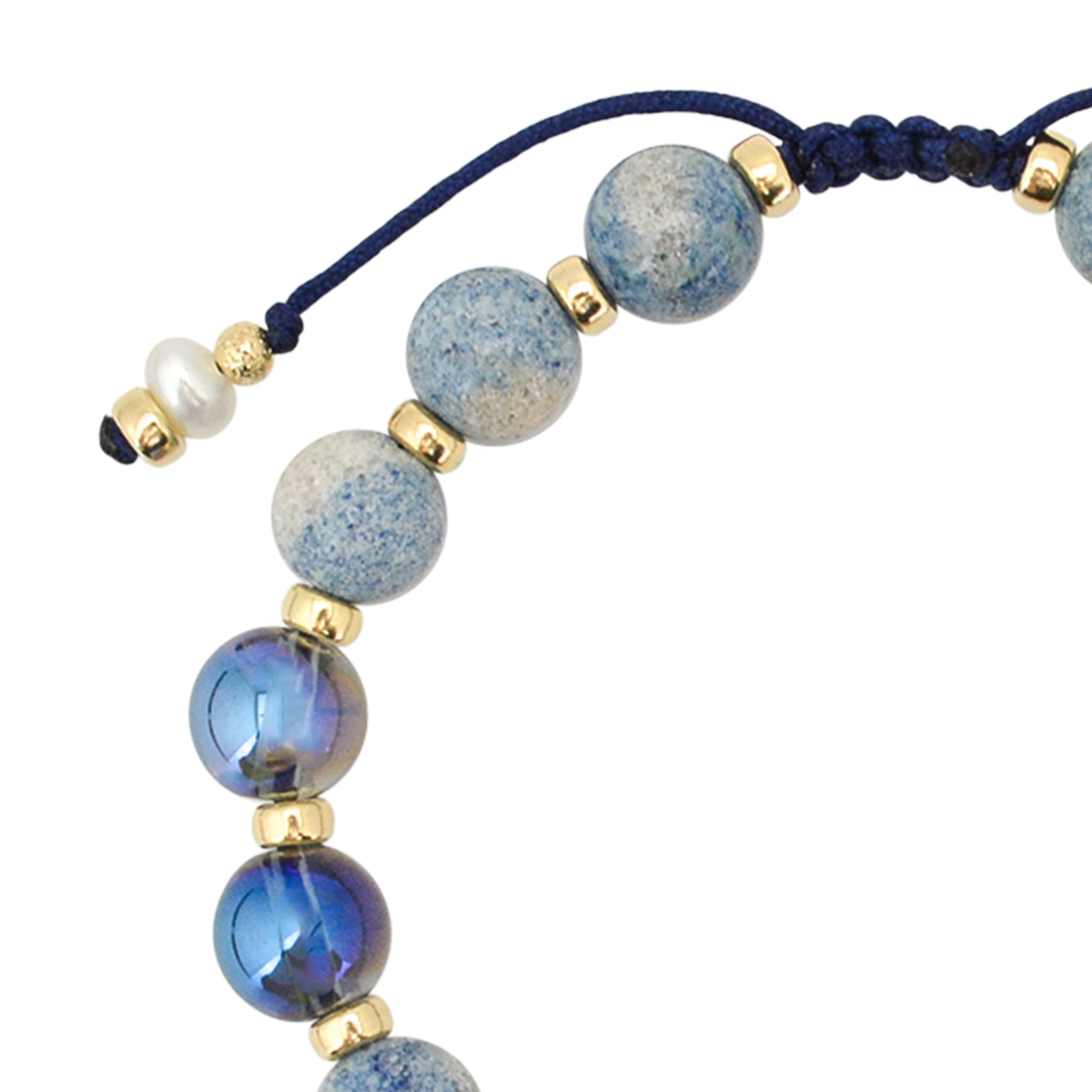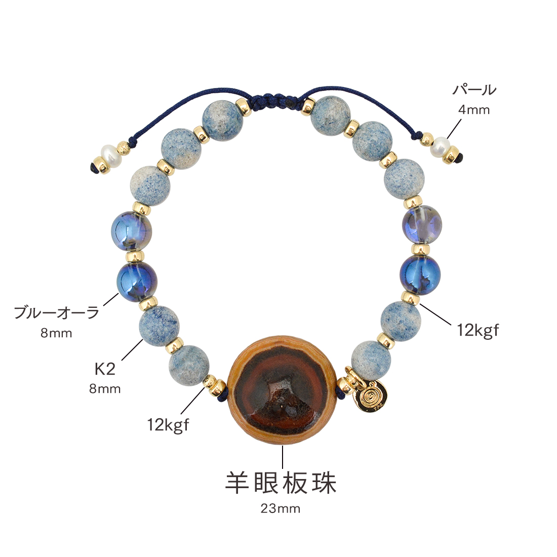 強力な魔除け。邪悪なものを防いで平安をもたらすといわれている羊眼板珠に、感覚面や自己表現力を高め、良い運を引き寄せやすくし、潜在能力を引き出すといわれているブルーオーラや、美の象徴とされ、女性のステータスを上げるといわれているパールなどを組み合わせたブレスレットです。