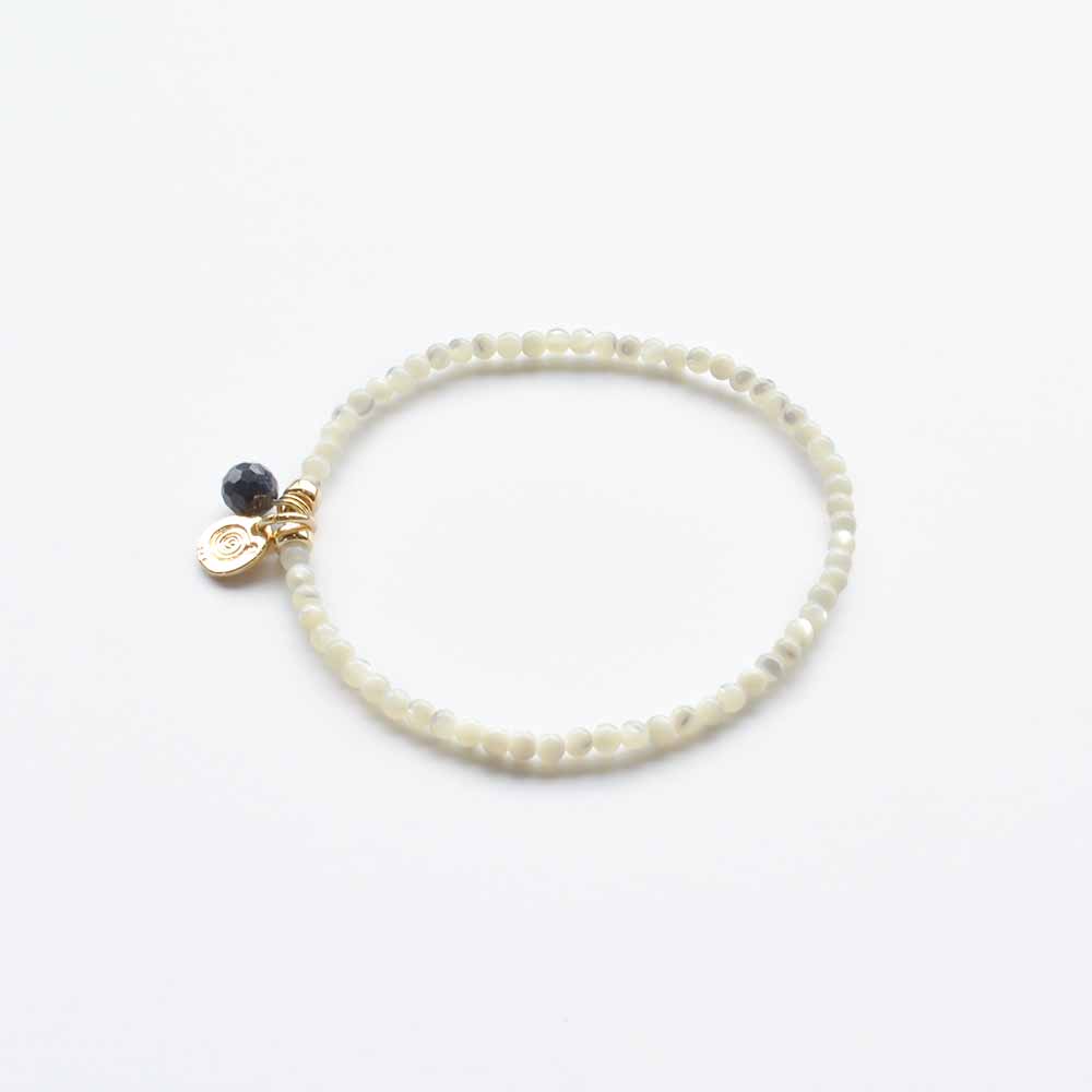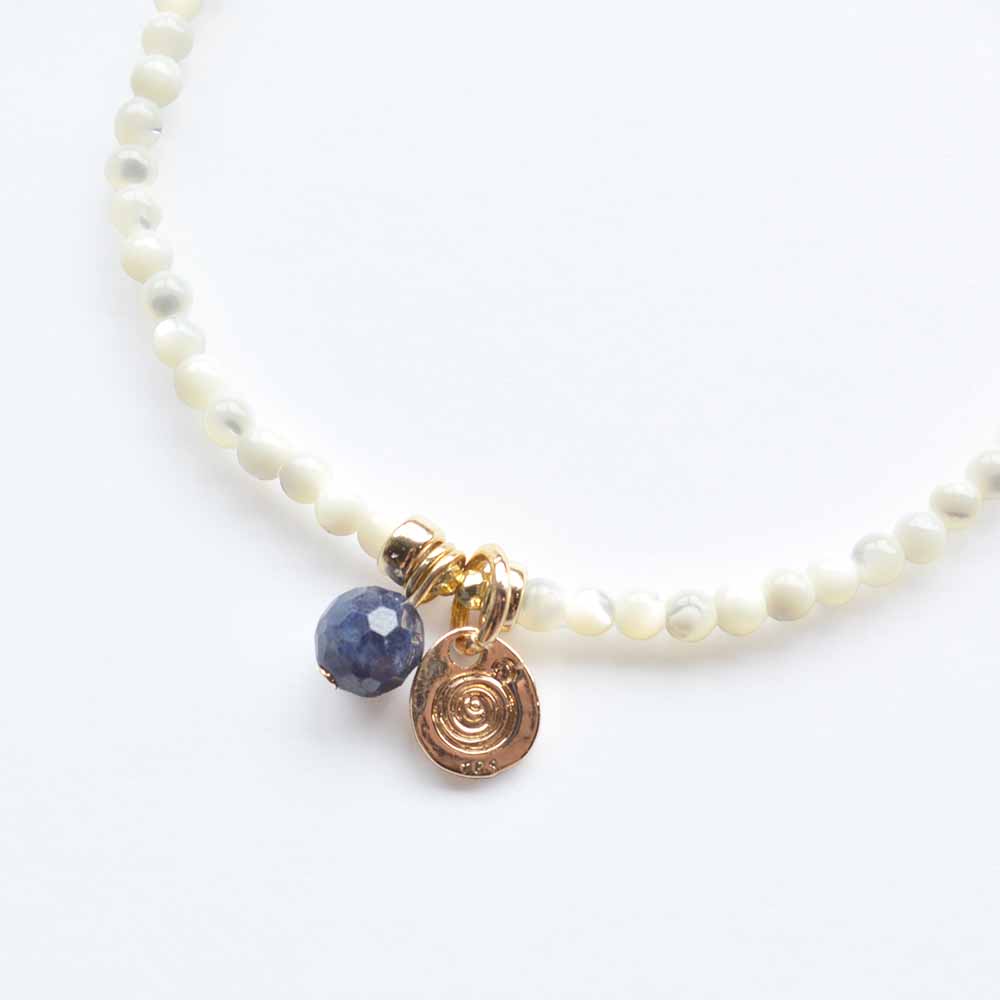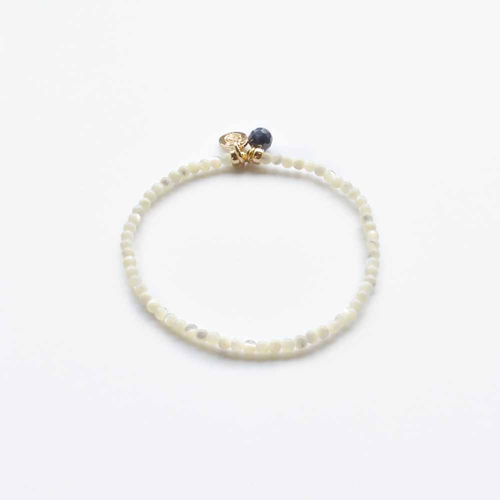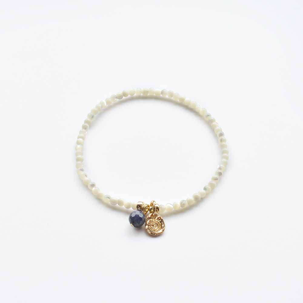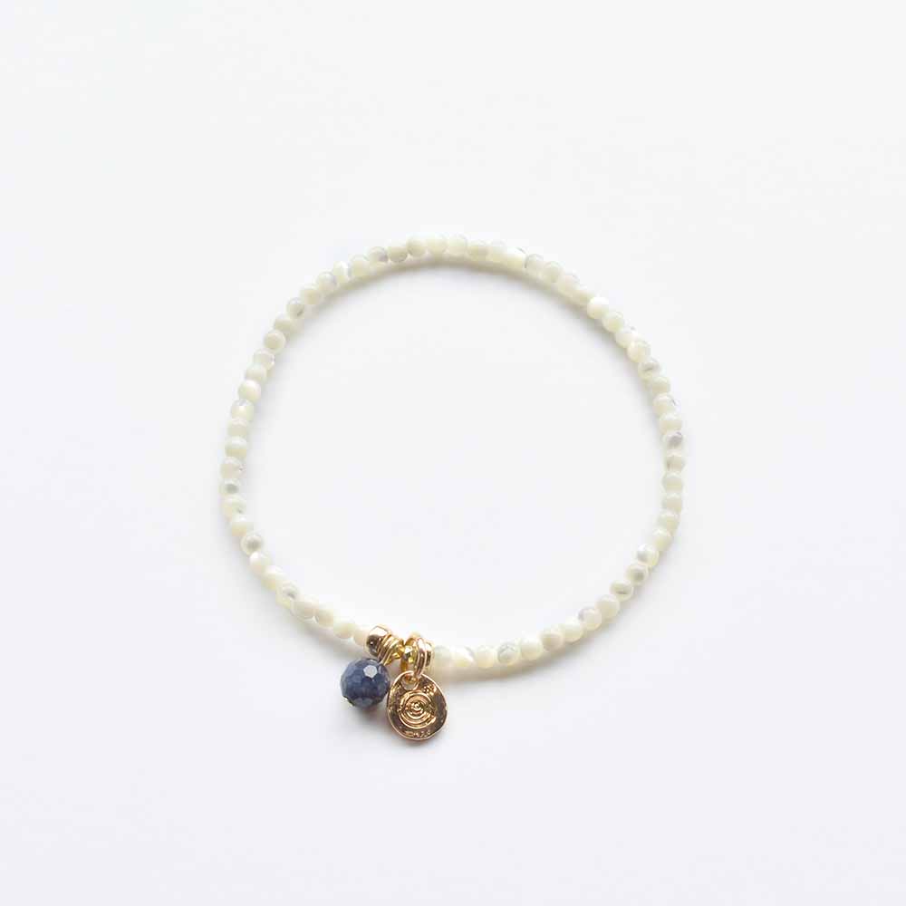 子宝や繁栄の象徴として、女性の魅力を高める石とされるマザーオブパールや、揺るぎない心の象徴、学問の石とも呼ばれ、不運を払うといわれているサファイアなどを組み合わせたブレスレットです。