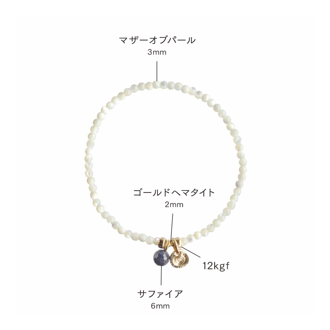 マザーオブパール+サファイア+ゴールドヘマタイト+12KGF+オリジナルメダルチャーム