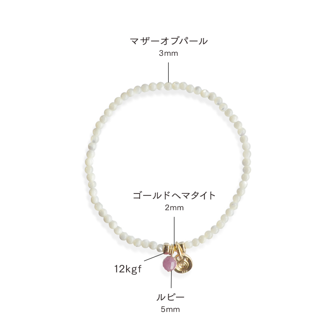 子宝や繁栄の象徴として、女性の魅力を高める石とされるマザーオブパールや、勝利の石と呼ばれ、生命力アップ・魔除け・情熱や深い愛情の象徴とされるルビーなどを組み合わせたブレスレットです。