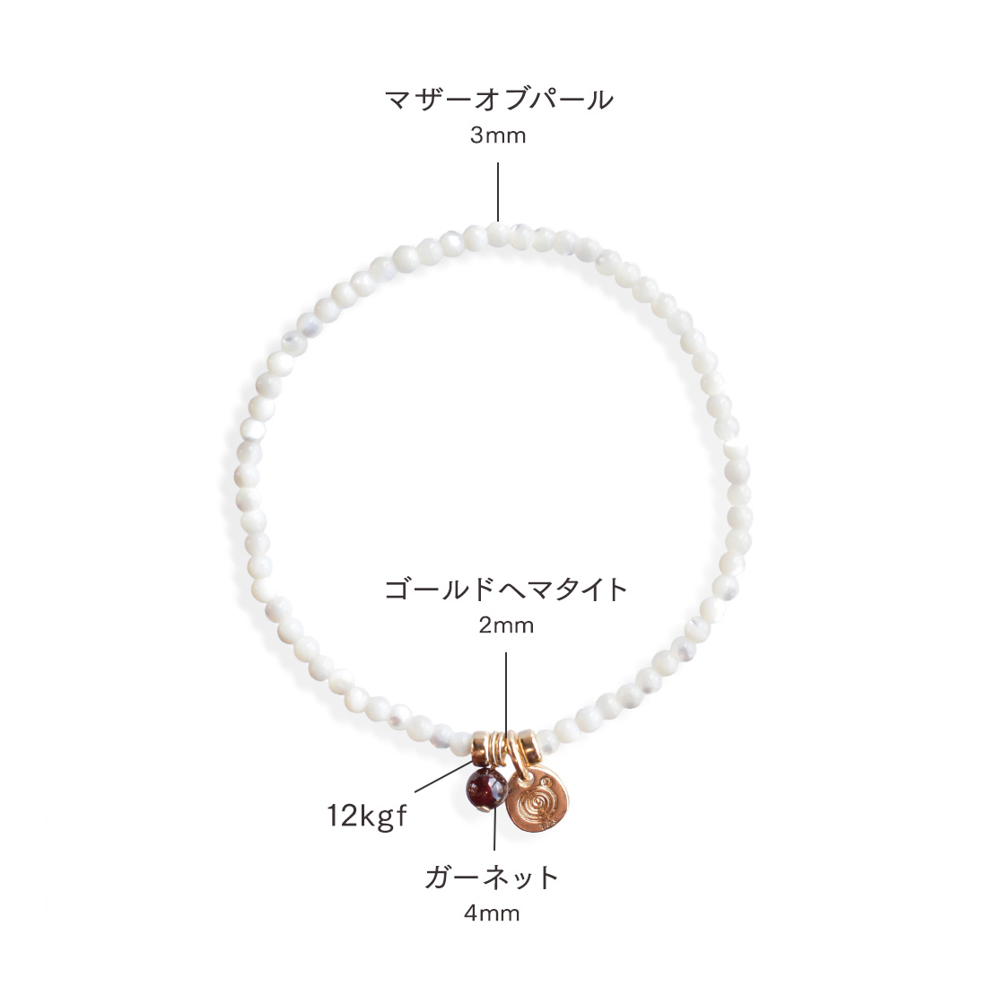 子宝や繁栄の象徴として、女性の魅力を高める石とされるマザーオブパールや、信頼と愛の石と呼ばれ、持ち主にポジティブなパワーを与え成功へと導くとされるガーネットなどを組み合わせたブレスレットです。