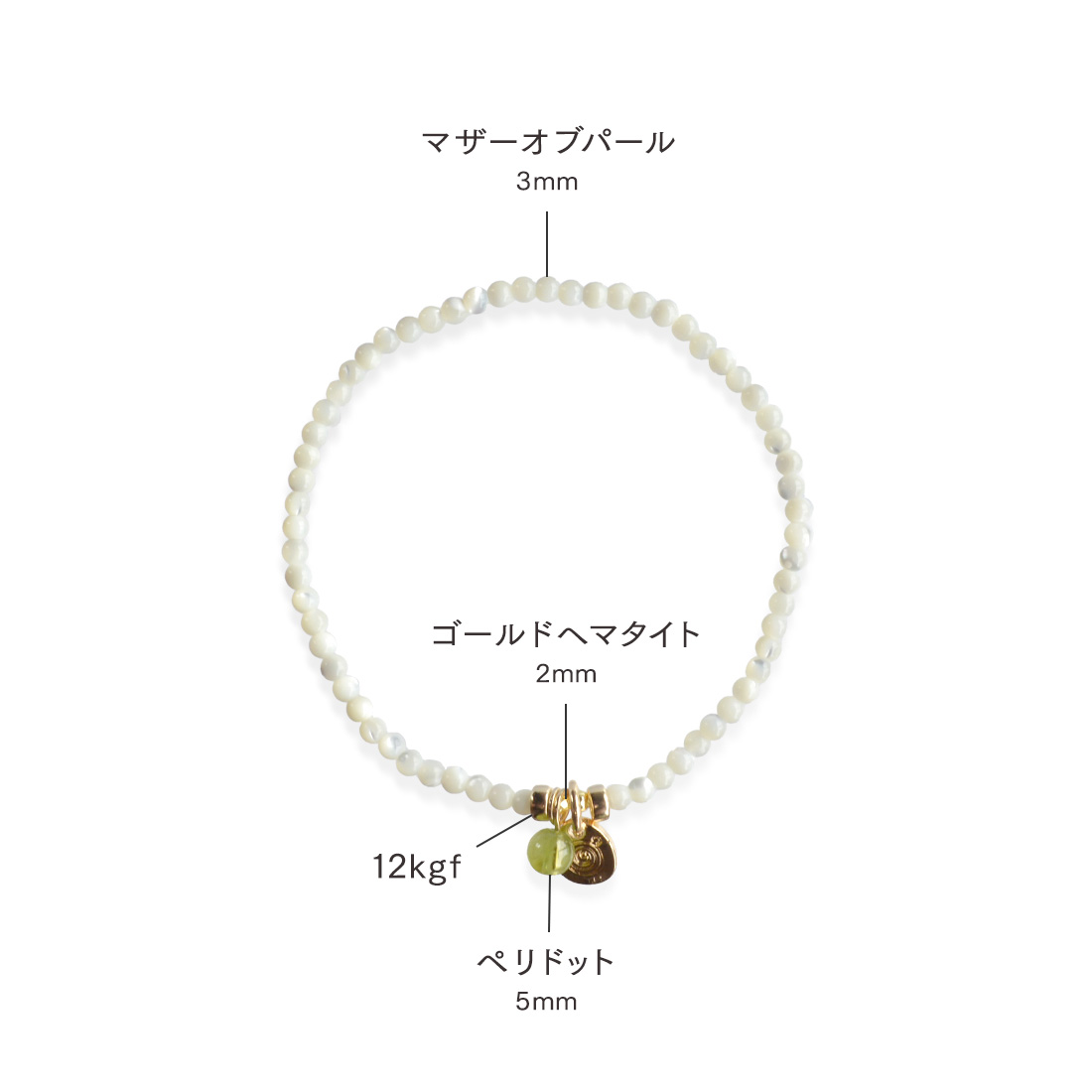 子宝や繁栄の象徴として、女性の魅力を高める石とされるマザーオブパールや、内面的に美しく輝くとされ、精神的な暗闇に光の導きをもたらすとされるペリドットなどを組み合わせたブレスレットです。