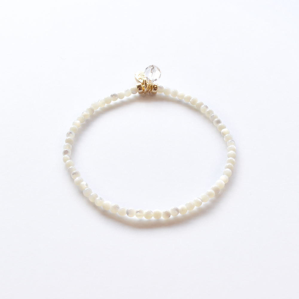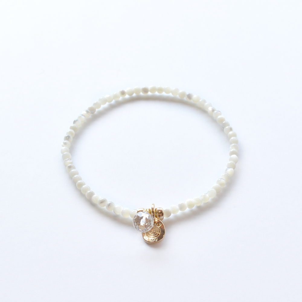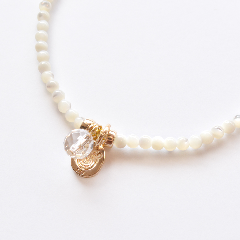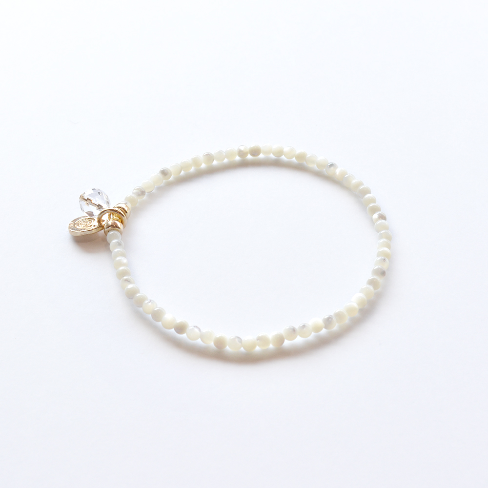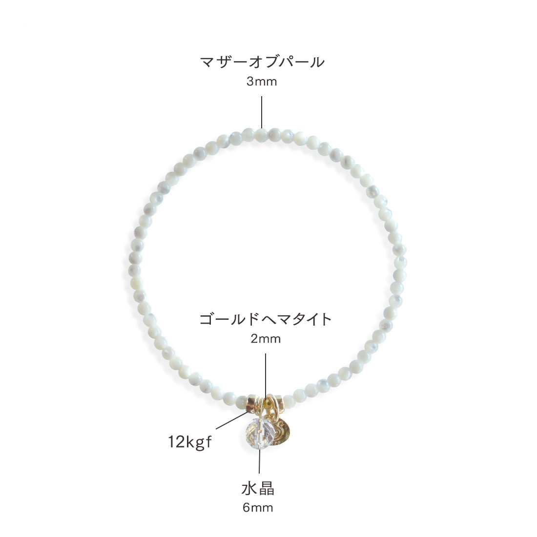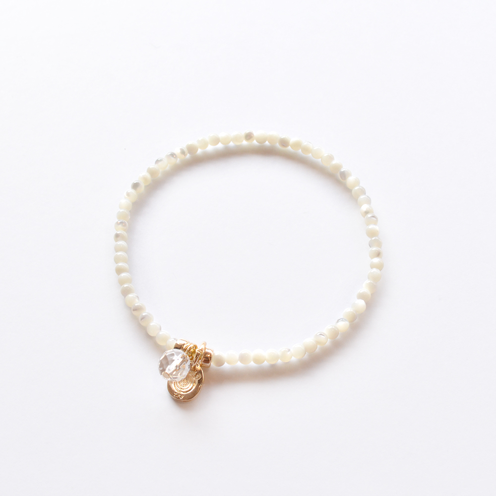 子宝や繁栄の象徴として、女性の魅力を高める石とされるマザーオブパールや、潜在能力を活性化させ、魔除けの作用を持つ万能パワーストーンとされる水晶などを組み合わせたブレスレットです。