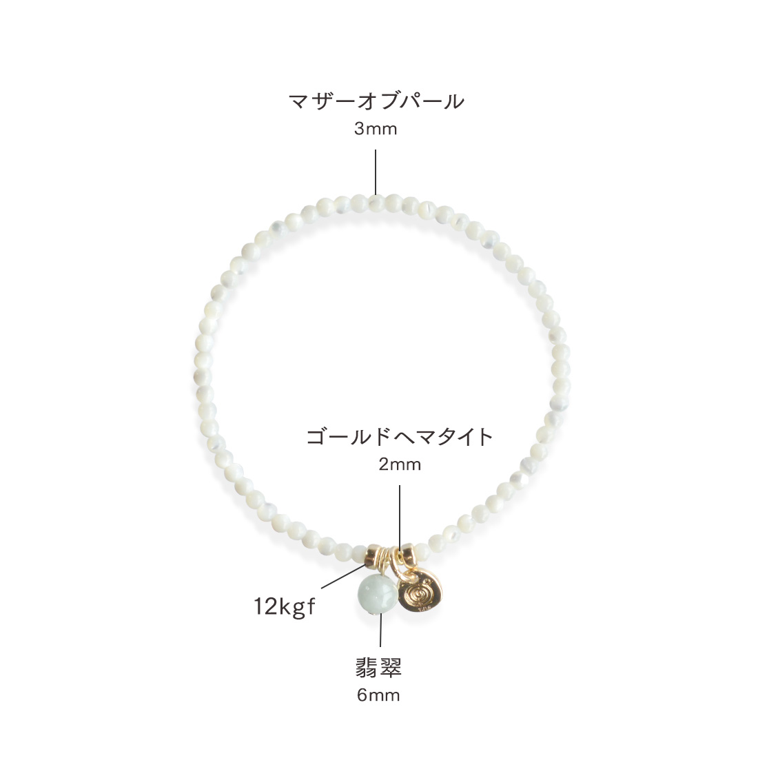 マザーオブパール+翡翠+ゴールドヘマタイト+12KGF+オリジナルメダルチャーム