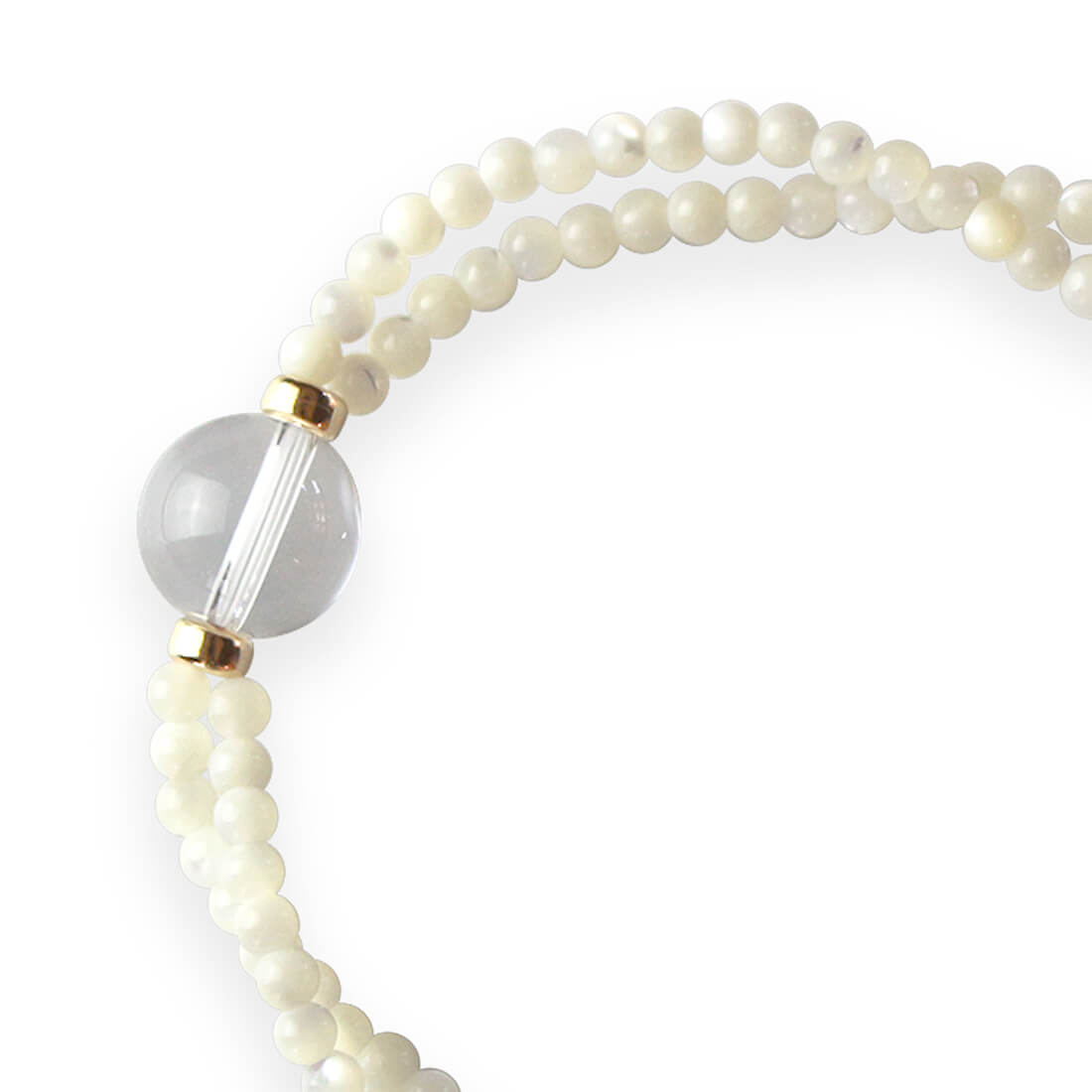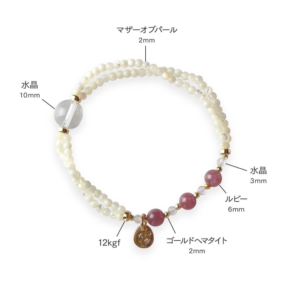 勝利の石と呼ばれ、生命力アップ・魔除け・情熱や深い愛情の象徴とされるルビーなどを組み合わせたブレスレットです。潜在能力を活性化させ、魔除けの作用を持つ万能パワーストーンとされる水晶、子宝や繁栄の象徴として、女性の魅力を高める石とされるマザーオブパール、持ち主の身を守り生命力を高めるとされ、金運・勝負運アップによいといわれているゴールドヘマタイトなどを組み合わせました。