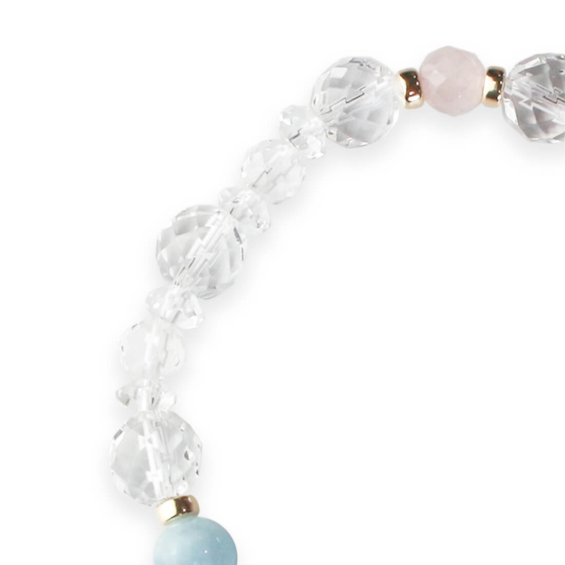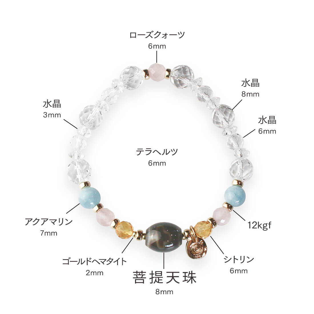 潜在能力を活性化させ、魔除けの作用を持つ万能パワーストーンとされる水晶、清らかな癒しのエネルギーで満たしてくれるとされるアクアマリン、太陽を象徴する石とされ、商売繁盛・事業成功・金運・財運・貯蓄運アップによいといわれているシトリン、持ち主の身を守り生命力を高めるとされ、金運・勝負運アップによいといわれているゴールドヘマタイトなどを組み合わせました。