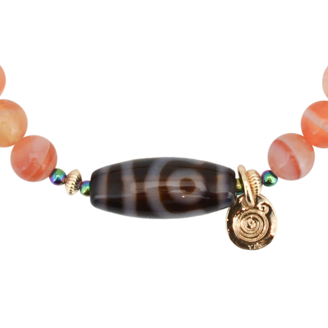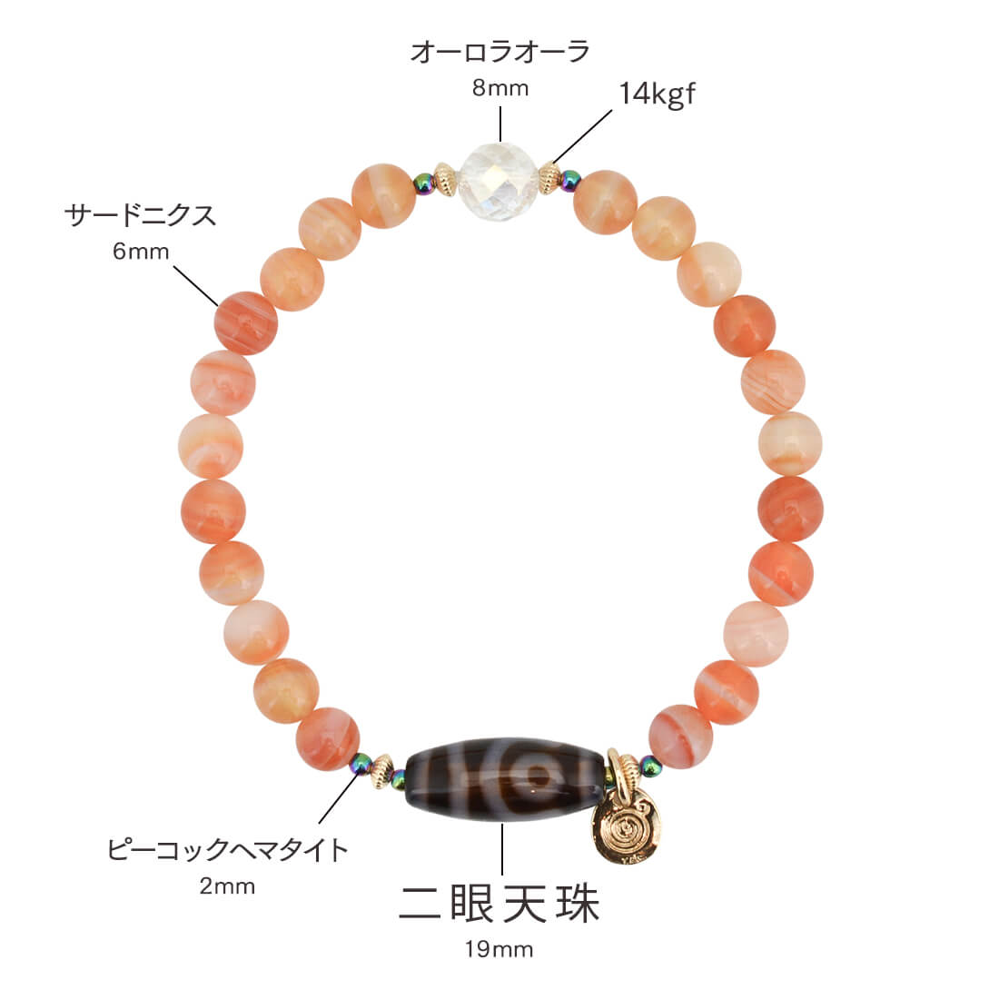 恋愛成就・夫婦円満・相互理解に力を発揮し、商売においても調和を促すといわれている二眼天珠に、夫婦の幸せ、愛や結婚の象徴、温かな家庭を築くことができるとされるサードニクスなどを組み合わせたブレスレットです。