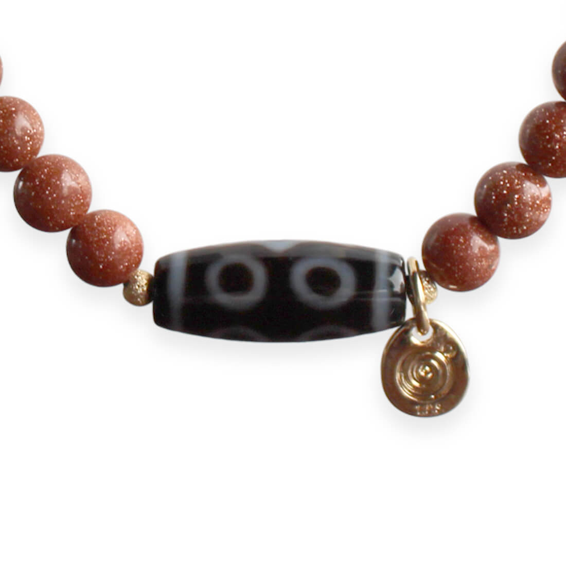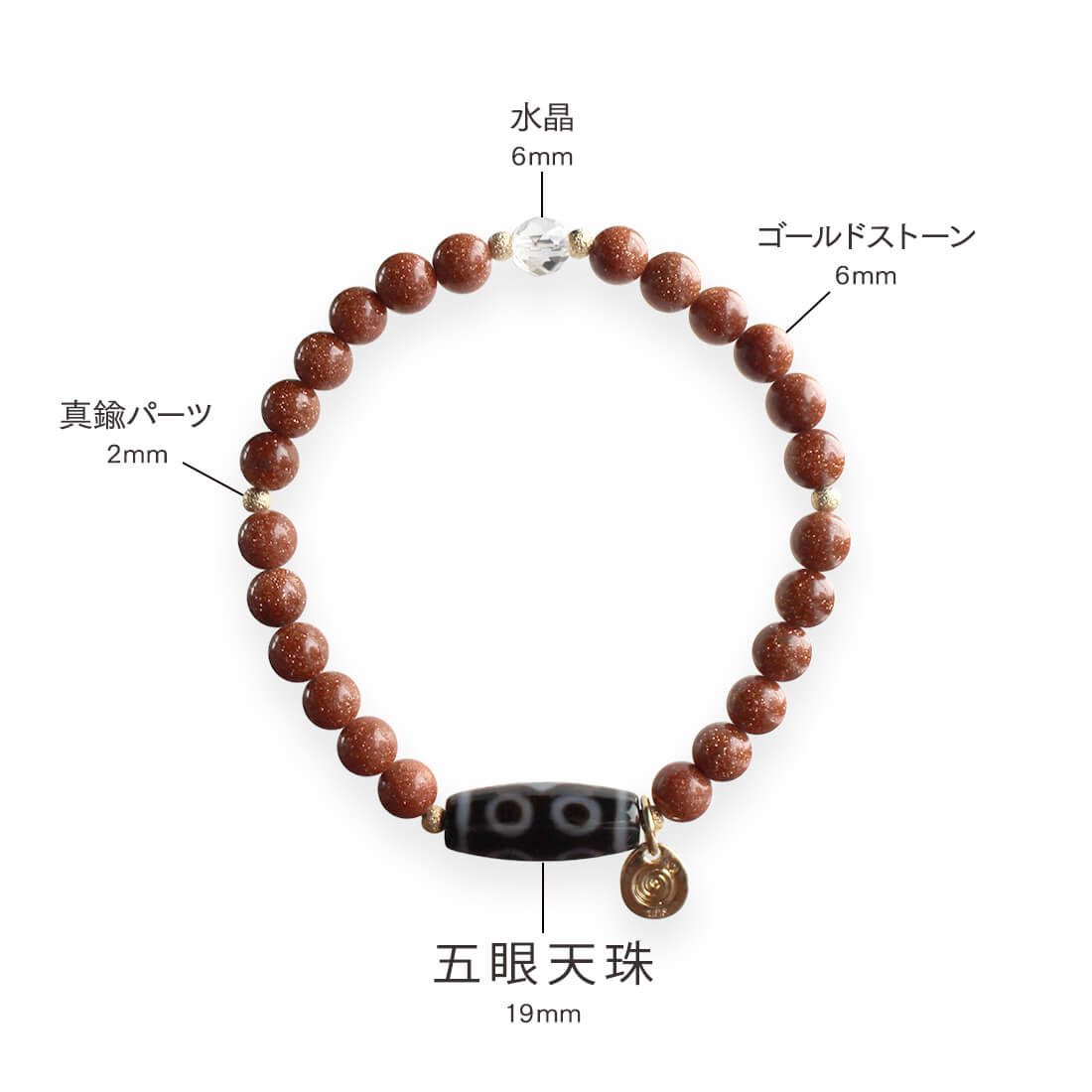 東・西・南・北・中央の五方向の如来により、あらゆる方位から身を守り、財運・行動力・決断力を得るといわれている五眼天珠に、人生において重要な出会いをもたらしてくれるとされ、金運アップによいといわれているゴールドストーンなどを組み合わせたブレスレットです。潜在能力を活性化させ、魔除けの作用を持つ万能パワーストーンとされる水晶などを組み合わせました。