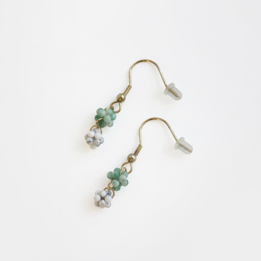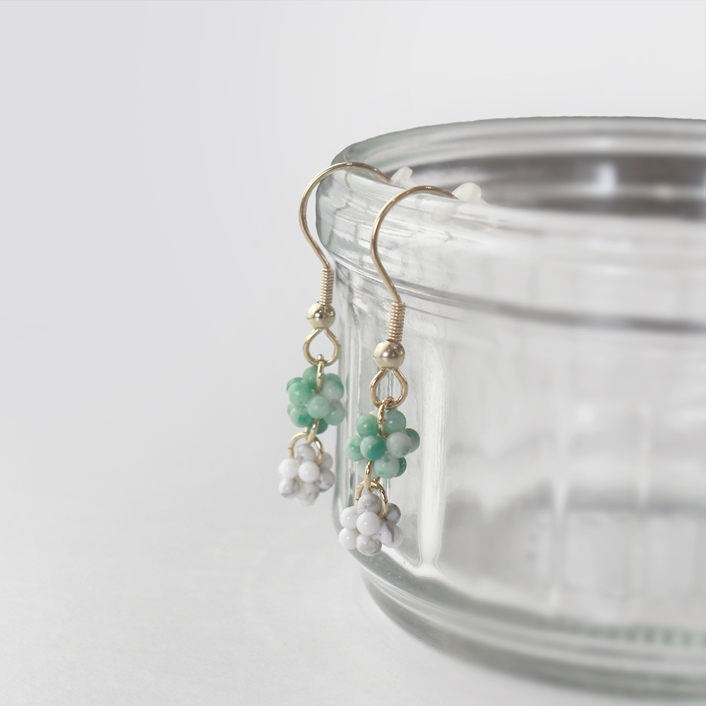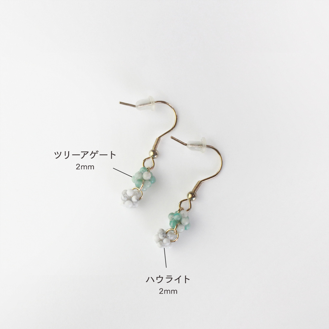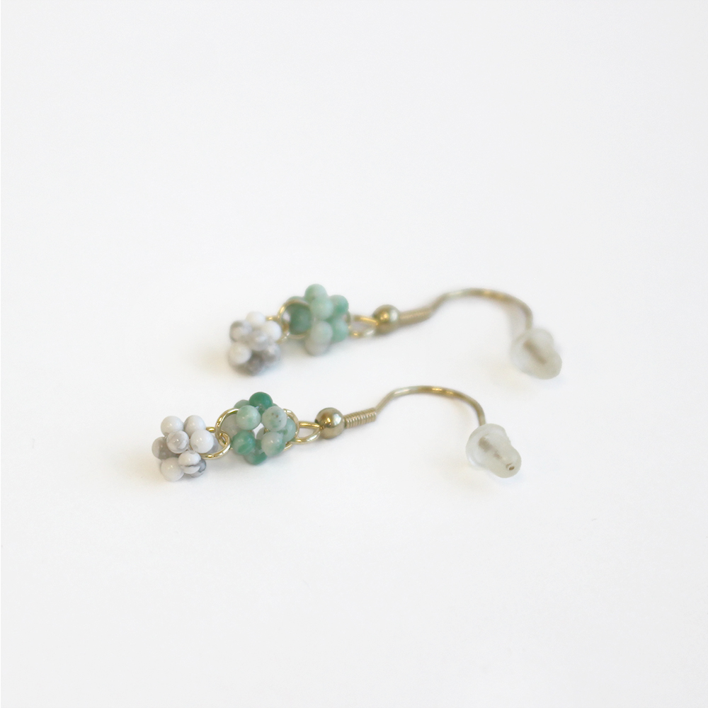 純粋・無垢の象徴。感情を鎮静させ、冷静さや洞察力を取り戻すとされるハウライトなどを組み合わせたピアスです。