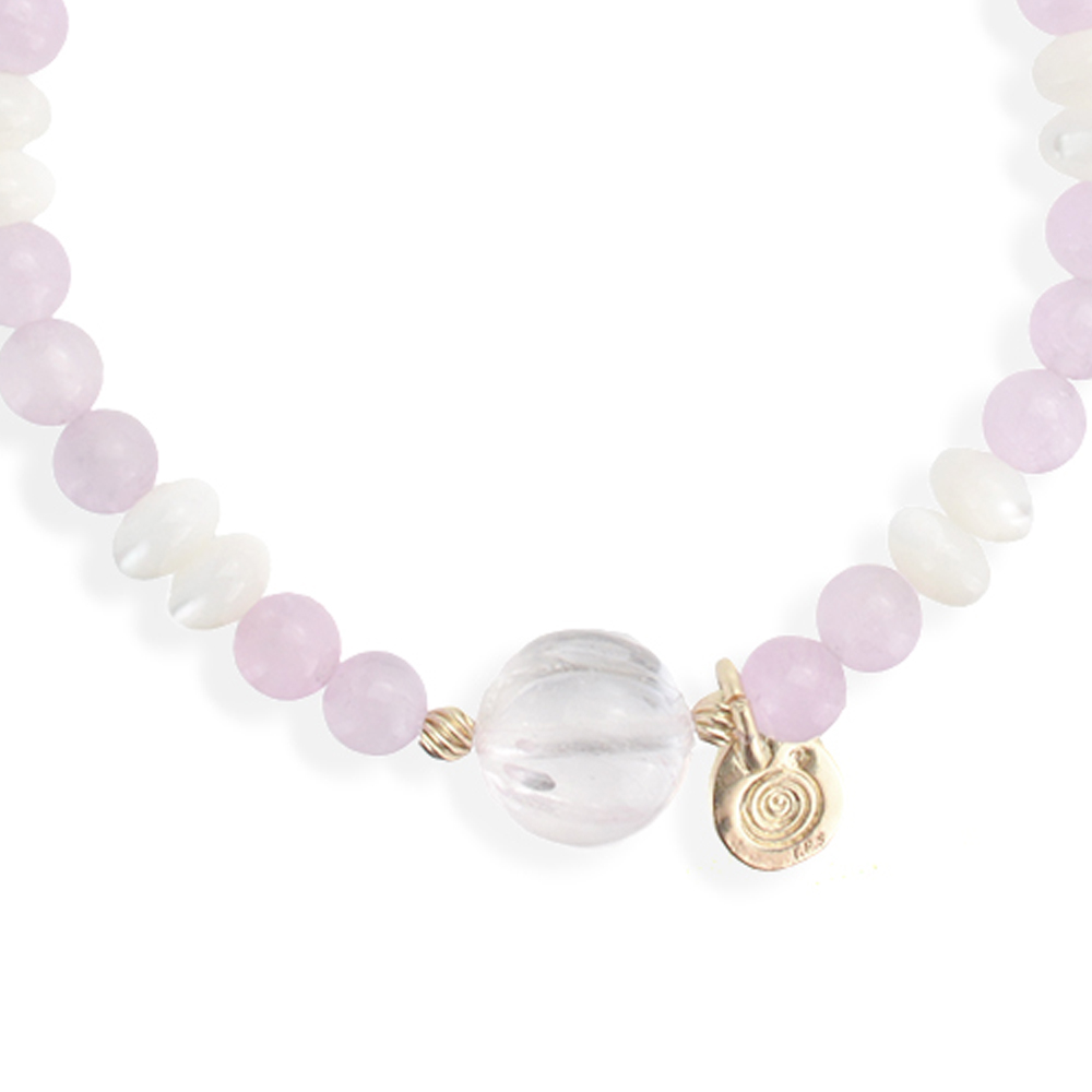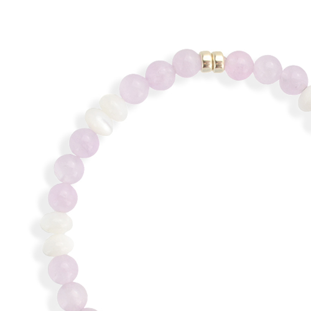 無償の愛を表し、清楚さと穏やかさを与え、甘え上手になるとされるクンツァイト、子宝や繁栄の象徴として、女性の魅力を高める石とされるマザーオブパールなどを組み合わせたブレスレットです。