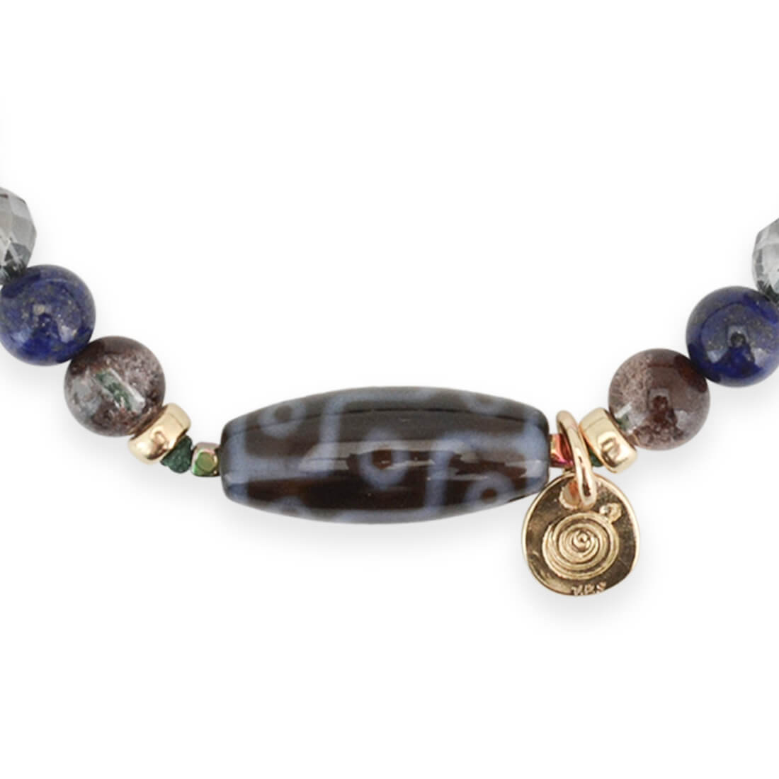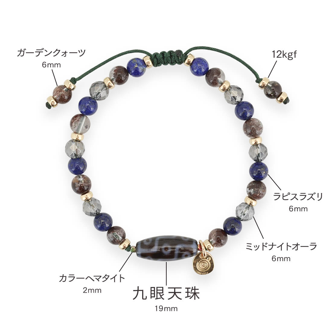 仕事運が向上。願望達成、権力と利益を倍増させるといわれている九眼天珠に、世界最初のパワーストーンとされ、魔除けの作用や幸運を招き願い事を叶えるといわれるラピスラズリなどを組み合わせたブレスレットです。