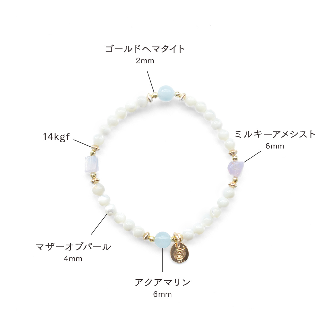 アクアマリン+マザーオブパール+ゴールドヘマタイト+ミルキーアメシスト+14KGF+オリジナルメダルチャーム