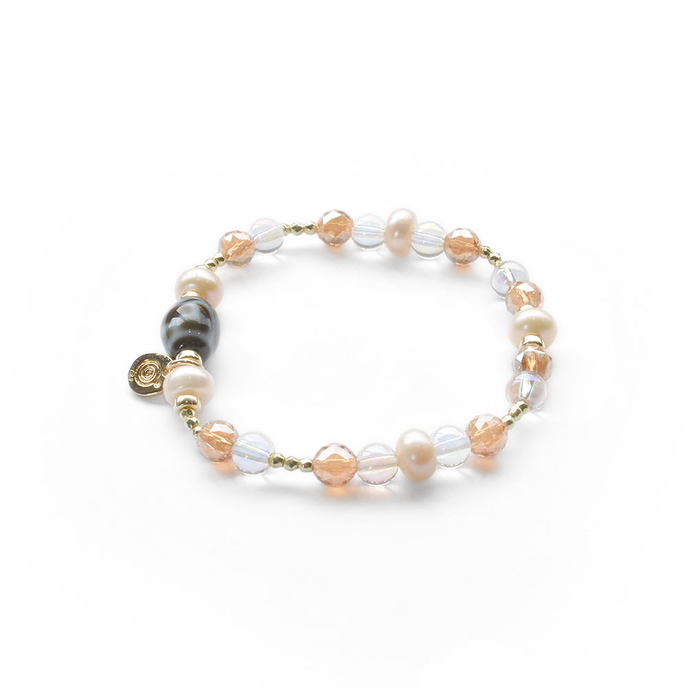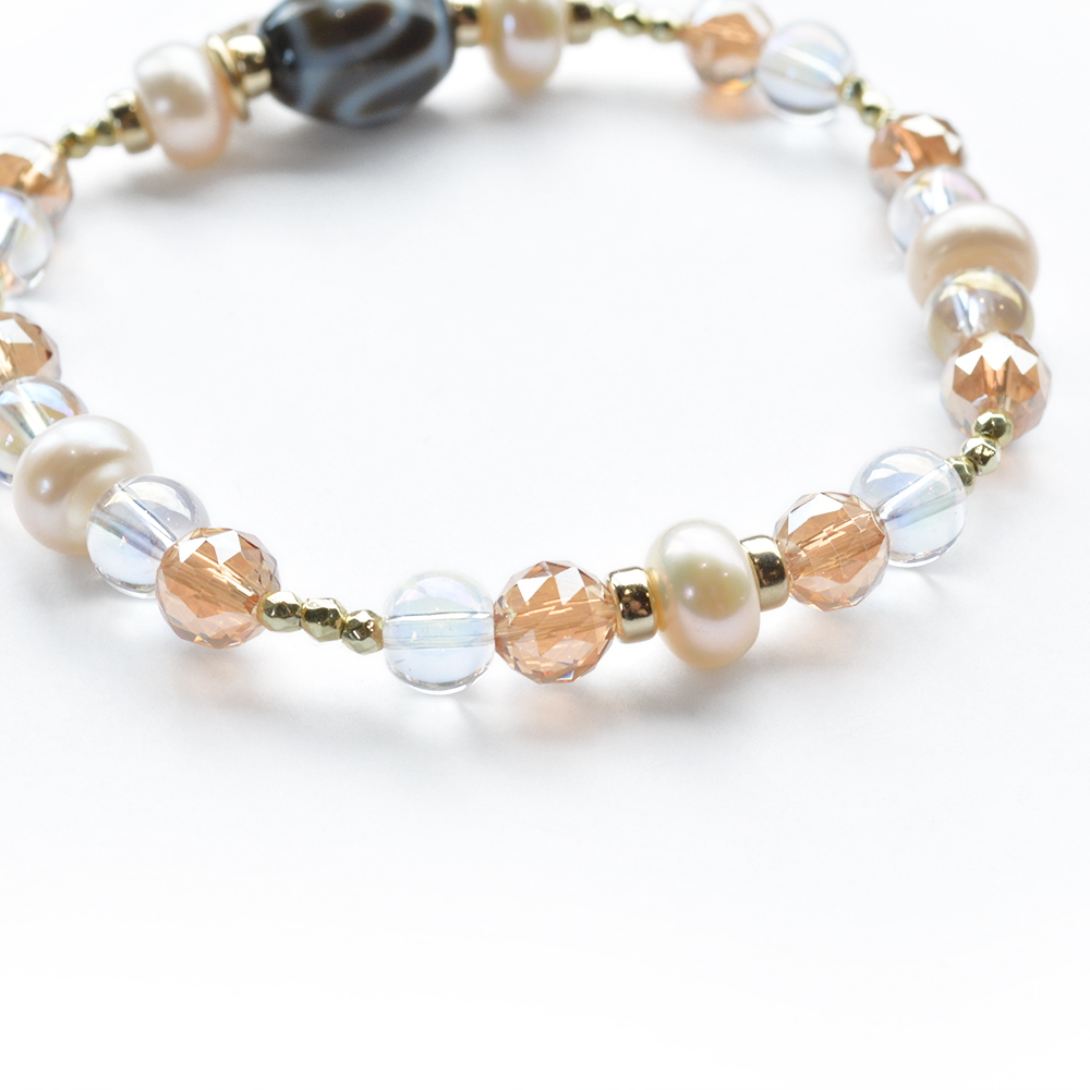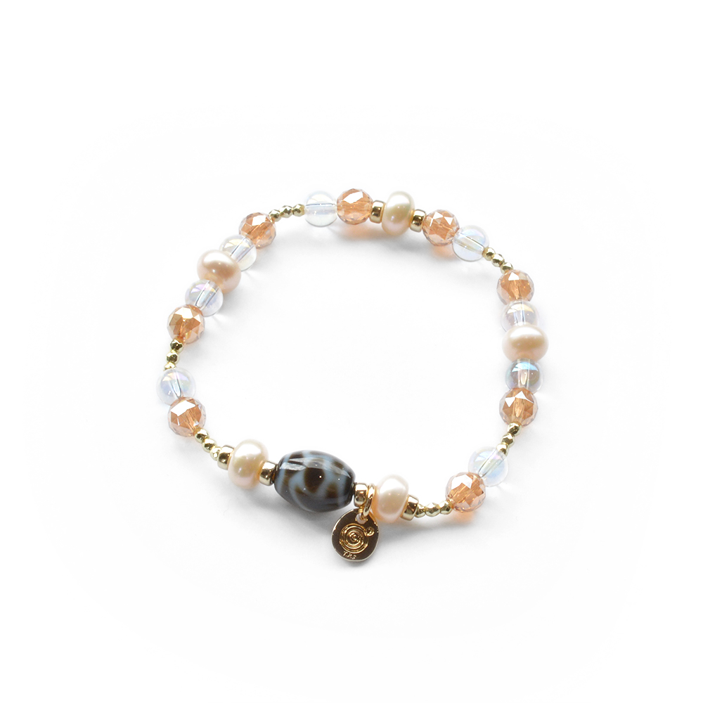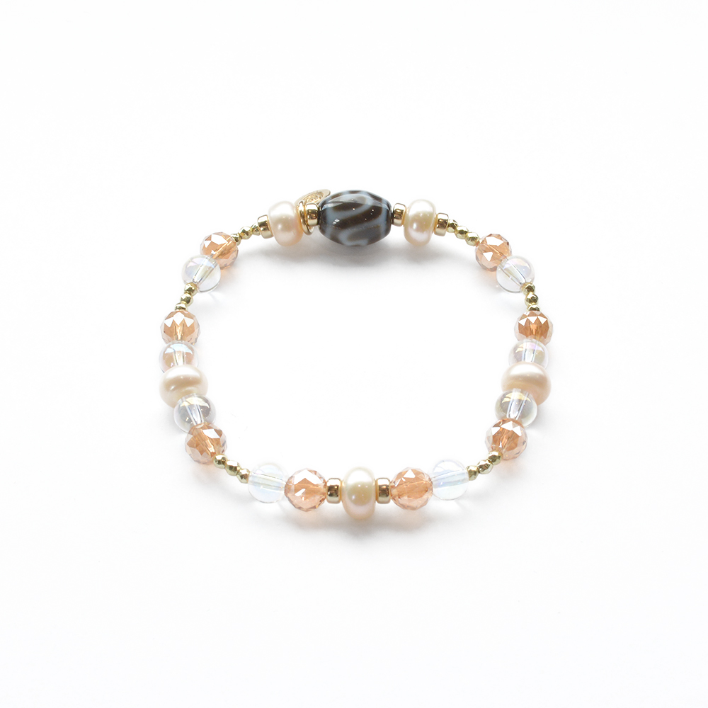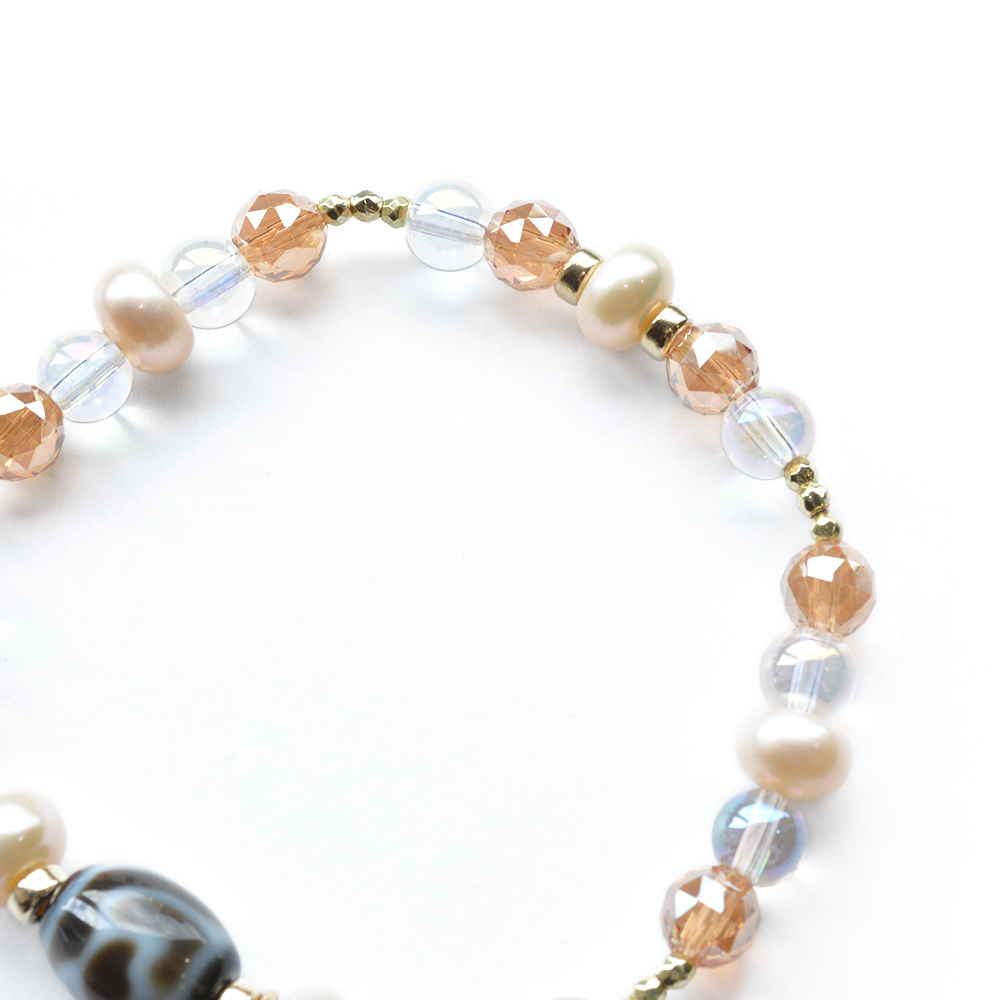他者の思惑に染まらず自分らしく生きられる。病魔を寄せつけず、健康になるといわれている水蓮花天珠に、美の象徴とされ、女性のステータスを上げるといわれているパールなどを組み合わせたブレスレットです。