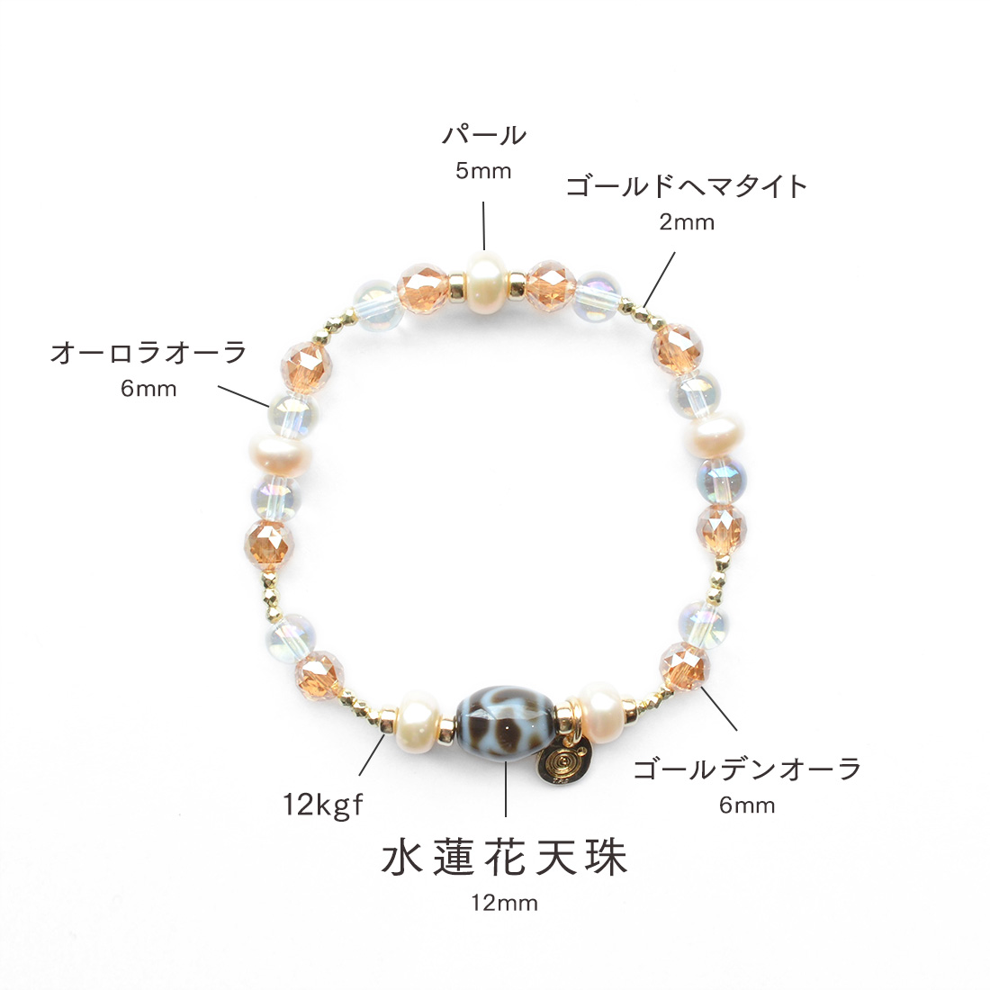 パール+ゴールデンオーラ+オーロラオーラ+ゴールドヘマタイト+12KGF+オリジナルメダルチャーム
