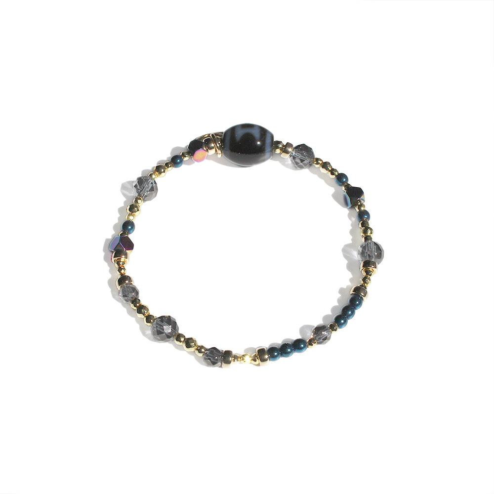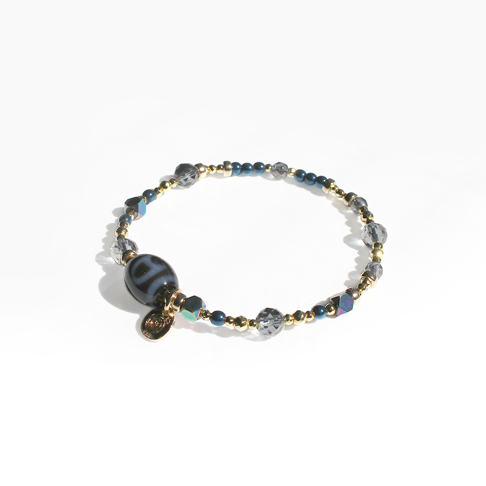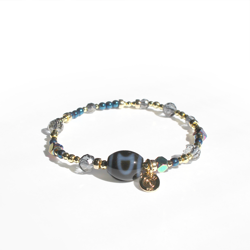 文様の太陽と月は、陽(男性)と陰(女性)の究極の対比を表し、恋愛成就・運勢も大上昇するといわれている日月天珠に、ストレスを軽減させ、精神力や独創的な思考を高めるといわれるピーコックヘマタイトなどを組み合わせたブレスレットです。