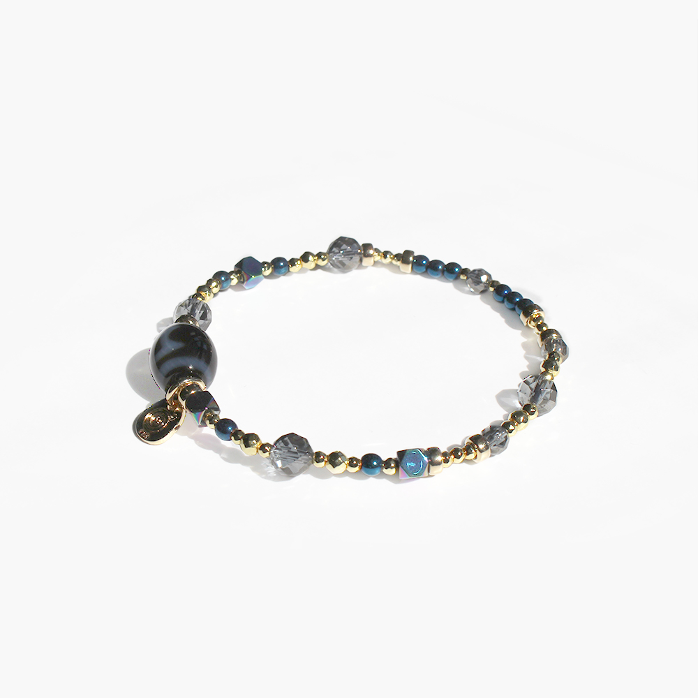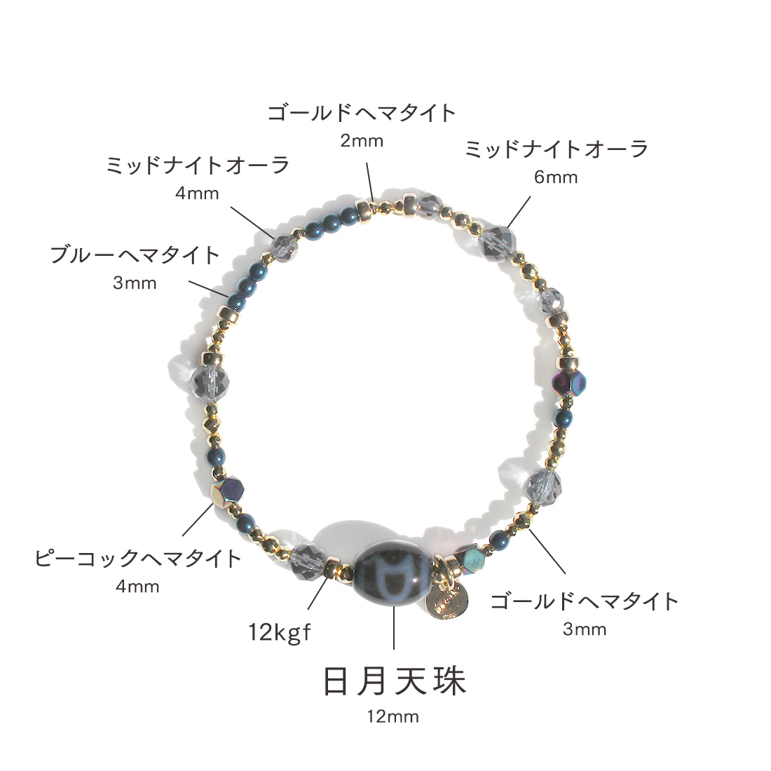 自身の成長を促し、自信を与えてくれるといわれるミッドナイトオーラ、持ち主の身を守り生命力を高めるとされ、金運・勝負運アップによいといわれているゴールドヘマタイトなどを組み合わせました。